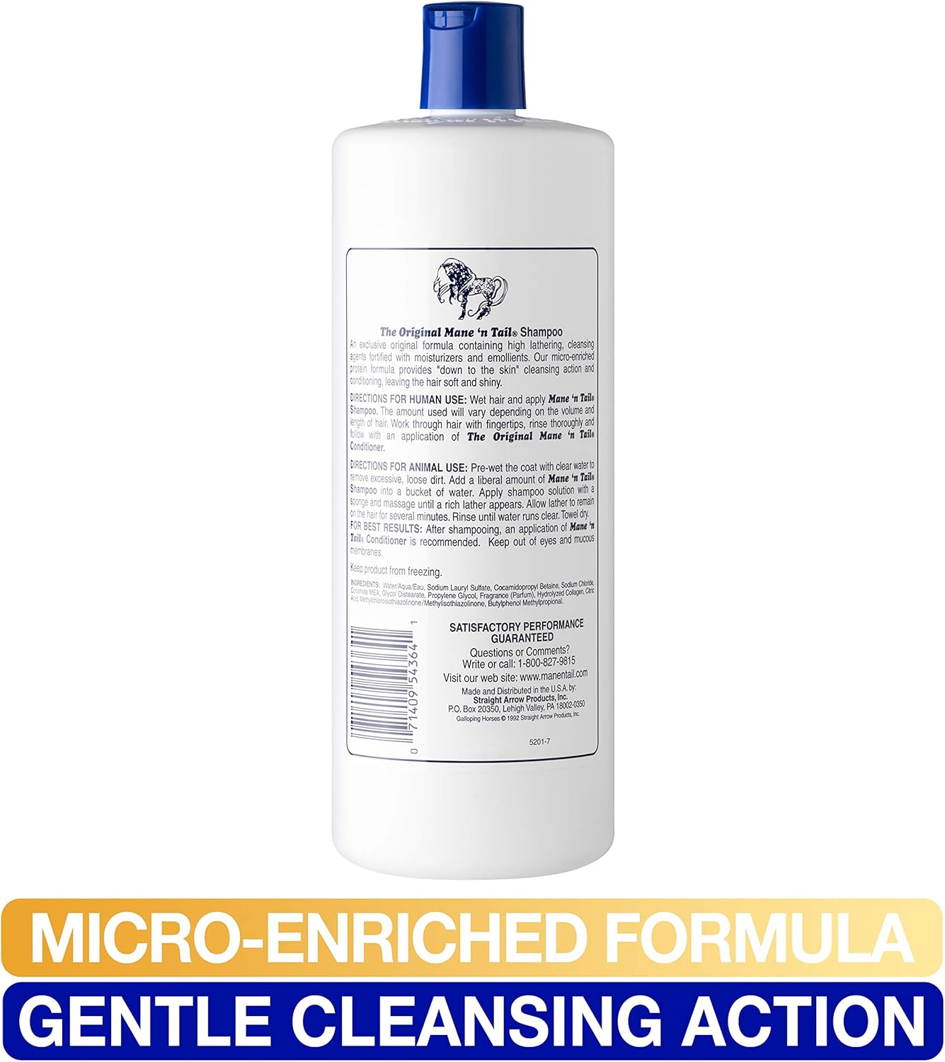 - The Original Mane 'n Tail 32 oz Shampoo Used by both people and pets the exclusive original formula contains high lathering cleaning agents fortified with moisturizers and emollients. Our micro-enriched protein formula provides deep cleaning action and conditioning, leaving the hair SOFT and SHINY.
