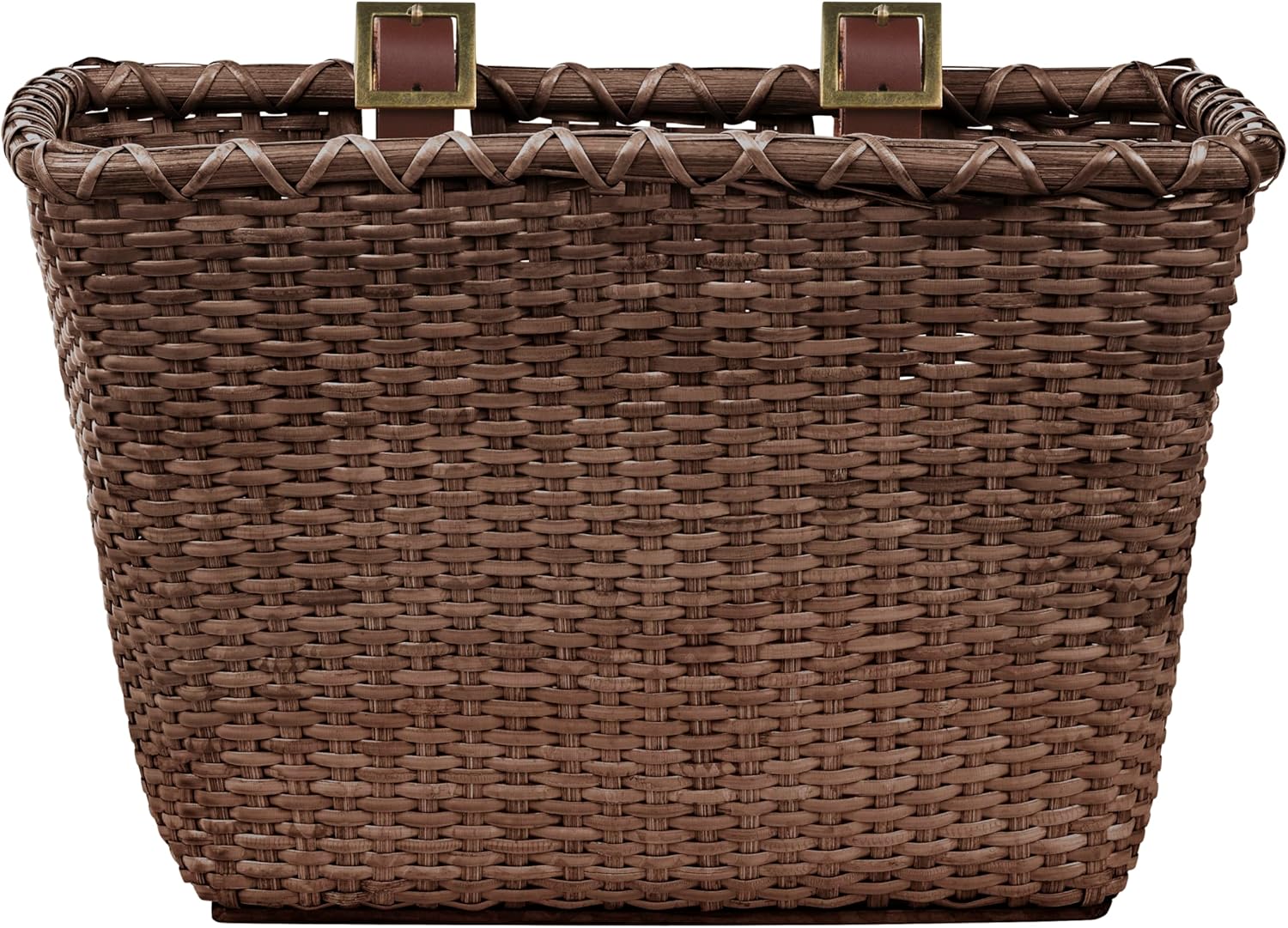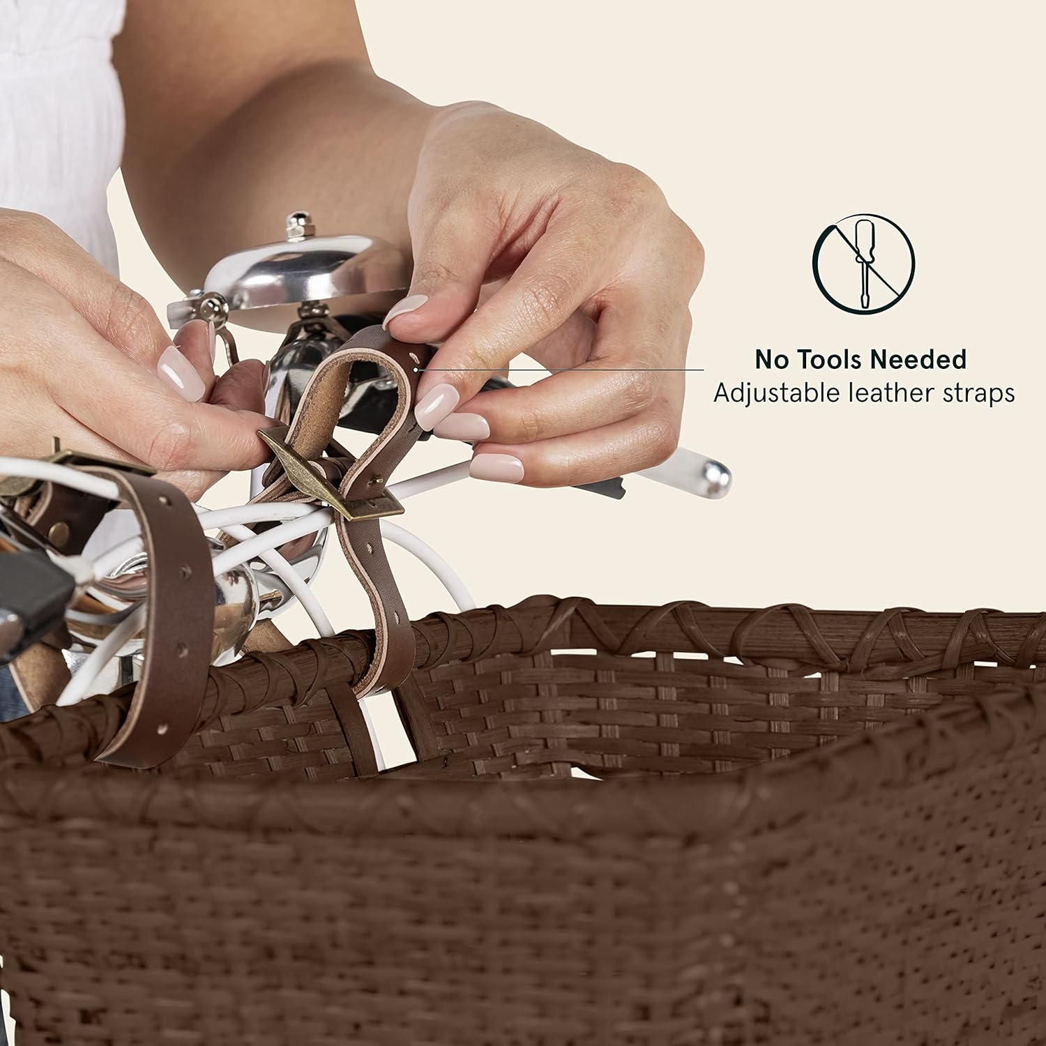 - Adjustable authentic leather straps with brass buckles attach basket to front handlebars without tools