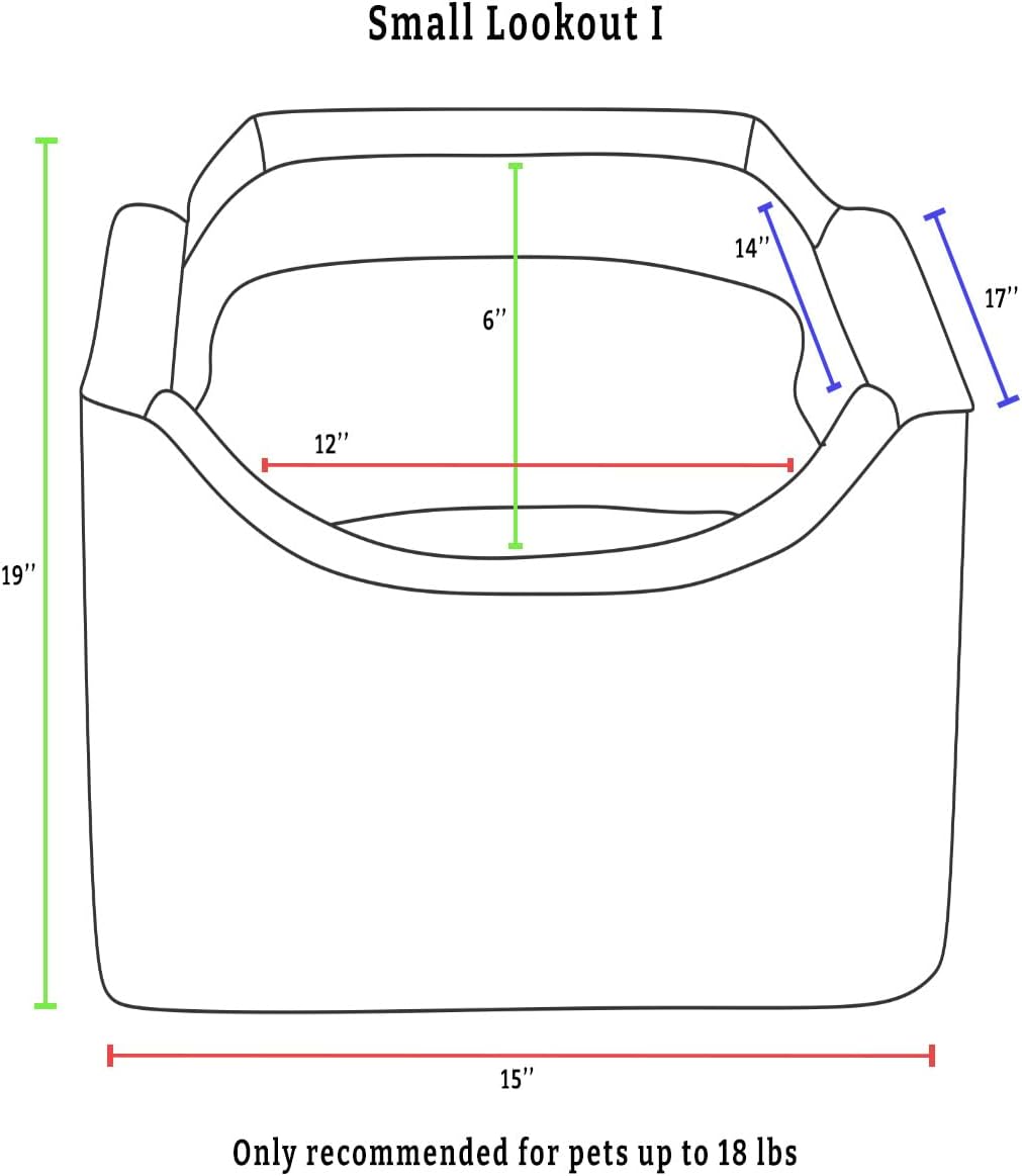 - This dog booster car seat for dogs small 5-15 lbs raises your pup 6” to allow for viewing out of the window. The removable pillow can add additional height if necessary. The enveloping microsuede interior is 12” x 14” and boasts 6” tall sidewalls to secure small breed dogs under 10” in length (like pomeranians, chihuahuas, and yorkies) within the dog car seat. The Lookout dog car seat measures 17″H x 15″W x 19″L and is an ideal back seat or front seat dog car seat, fitting inside a single seat.
