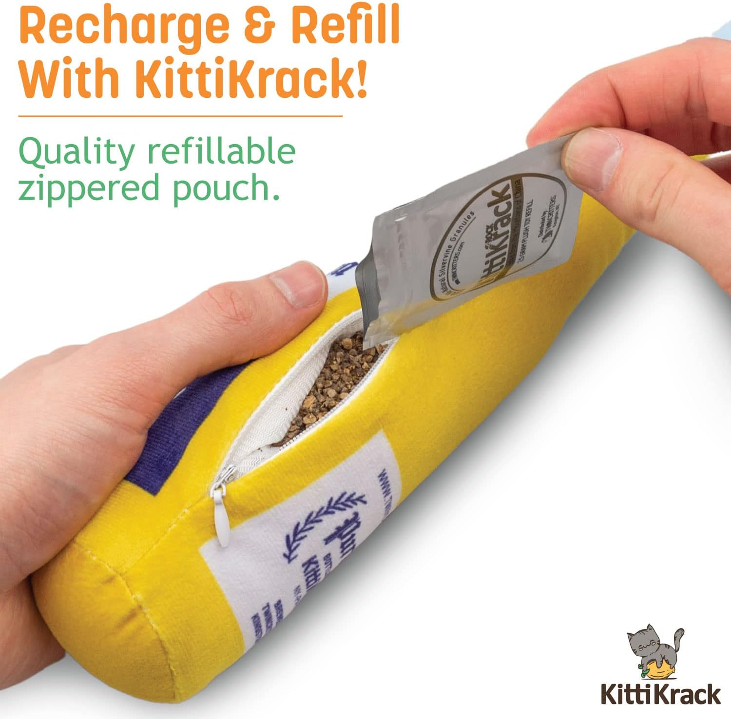 - Refillable Cat Toy: Each KittiForti plush cat toy is able to be refilled with TWINCRITTERS KittiKrack Rock refills so your furry friend can keep the fun going! Our silver vine cat and kitten toys are a great compliment to regular cat treats and are purr-fect for playing, teething, and can stand up to the signature "kitty kicking".