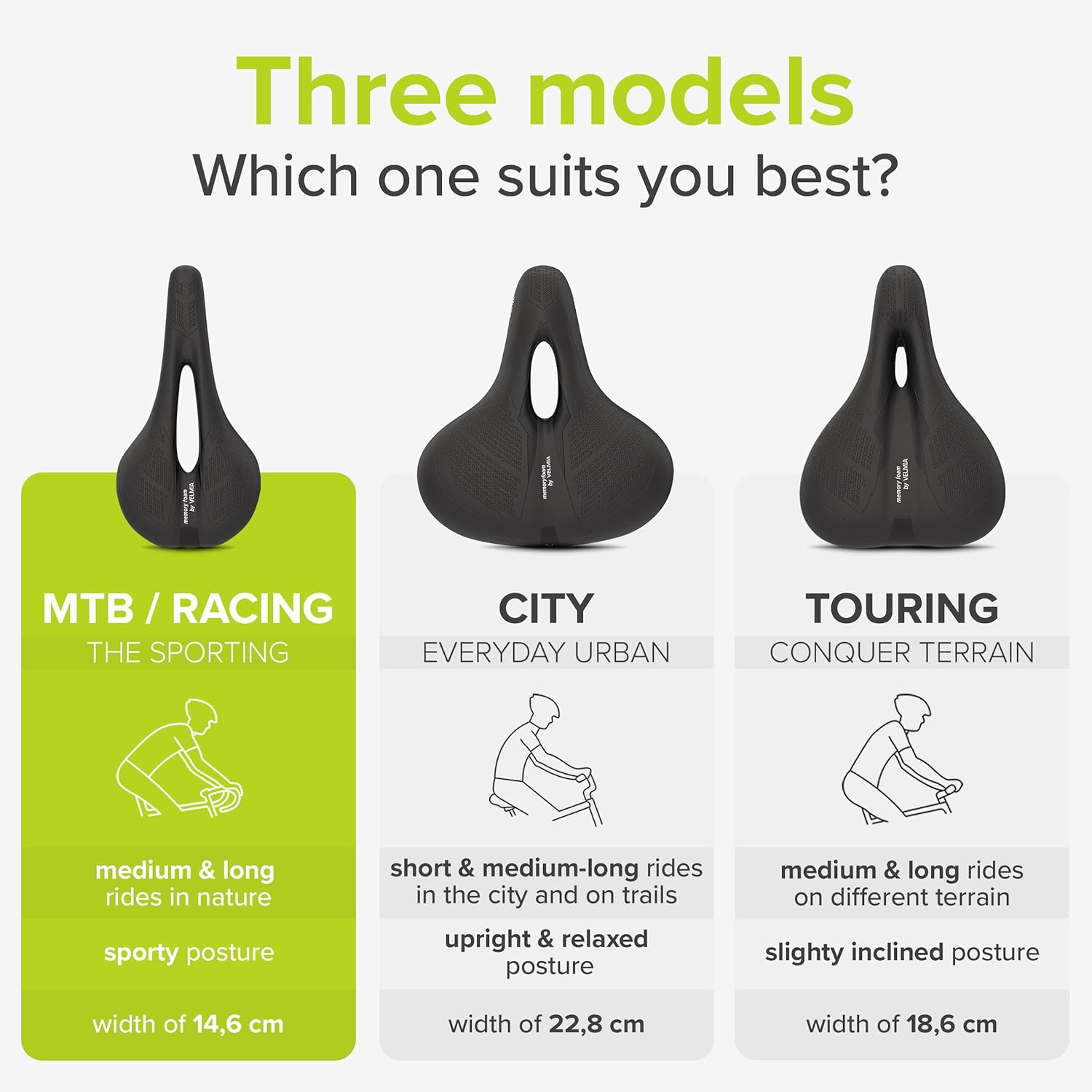 - MADE FOR YOUR RIDING POSITION - There are three specific models of the bicycle saddle, so you can choose the Velmia bike seat depending on your individual riding position and riding style needs!