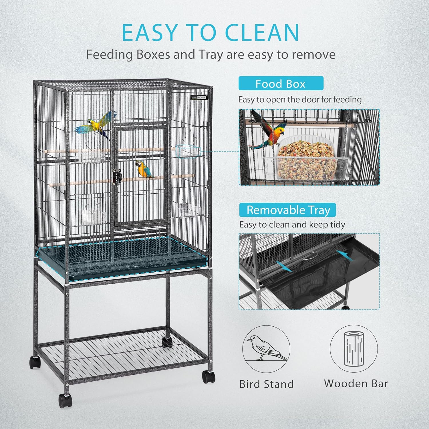 - ABUNDANT ACCESSORIES - In addition to the high-quality steel frame bird cage, we also provide you with 4 plastic transparent food boxes, 2 wooden perches and a tray in the cage; Different food boxes can feed different nutritious food to birds, which is conducive to the better reproduction and growth of diverse birds
