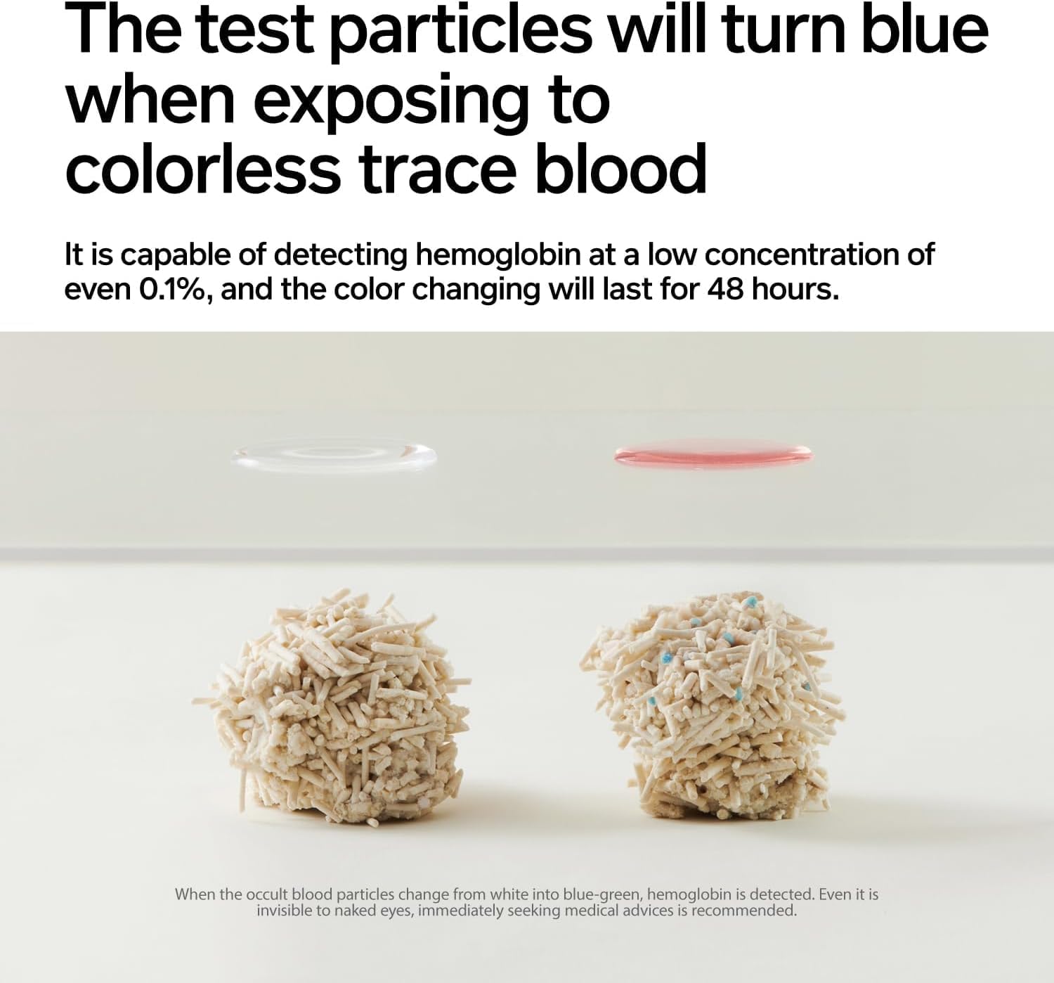 - 【Attention】 1.Direct exposure to hard light or friction with metal would invalid the detection function of the occult blood test particles. Please avoid such situations.2.Mineral substance contained in bentonite would affect the detection performance. Do NOT mix the product with other cat litter. 3.The vacuum design is only to facilitate its transportation and storage, and air leakage does NOT compromise the use. If you DO mind, please contact us.