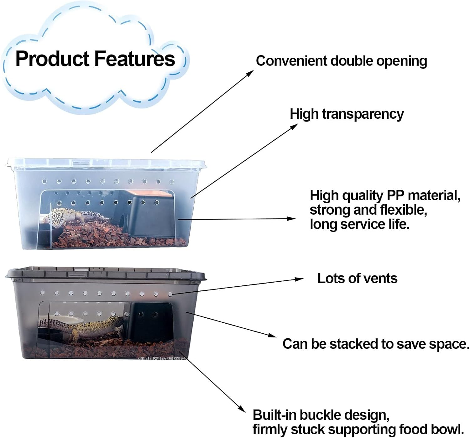 • Suitable pets : The reptile feeding hatching container size is 12.6" x 8.7" x 5.9" (L*W*H). Suitable for snakes, tarantulas, scorpions, geckos, crickets, snails, hermit crabs, frogs, lizards, baby tortoise and other reptile animals