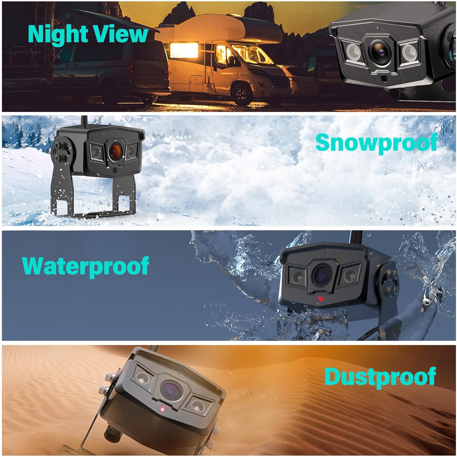 - ππ Long Signal Transmission Distance - This trailer backup camera wireless with monitor is suitable for Cars, RV, Truck, Semi-Trailer, Pickups, Camper, Van, 5th wheel, Motorhome. The signal can reach over 300ft in open area, and 50ft on vehicle for reversing or 36ft on vehicle for continuously use. With IP69K waterproof standard, the wireless backup camera rv can work in extreme weather from -4β~176β. No lens water or fog issues.