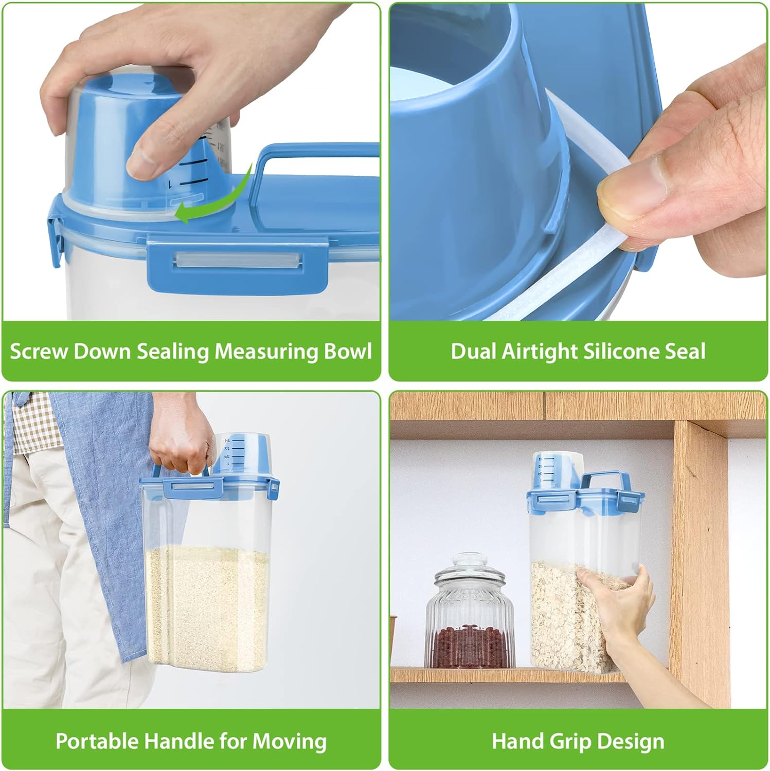 - SMART KITCHEN STORAGE CONTAINER: make your pantry perfectly organized with this smart container. Suitable for Beans, Flour, Sugar, Coffee, Rice, Nuts, Snacks, Pet Food and More (Note: Container storage capacity varies by food. Only store about 3 lbs of pet food or flour.)