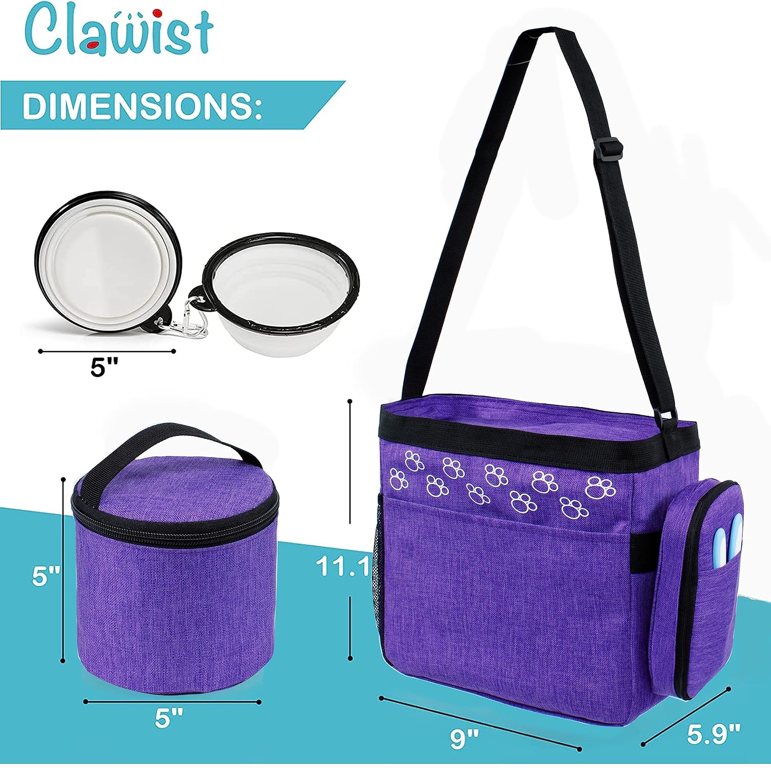 - DURABLE AND STYLISH - Clawist dog travel bag Made with premium materials, this travel organizer kit for pets holds all your pet essentials: dog food, treats, a water bottle, toys and other dog travel accessories.Built-in D rings for hooking your water bowl and dog leash.