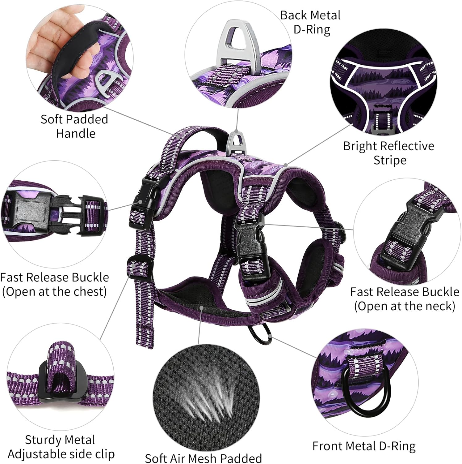 - 【4 WAYS ADJUSTABLE STRAPS】The fit of this pet harness can be completely customized for your pet using the slide adjusters at the chest and neck.You can use its 2 neck straps and 2 chest straps to create a Perfect Fit for your dog with some room of growth. No worries about slipping out or choking.