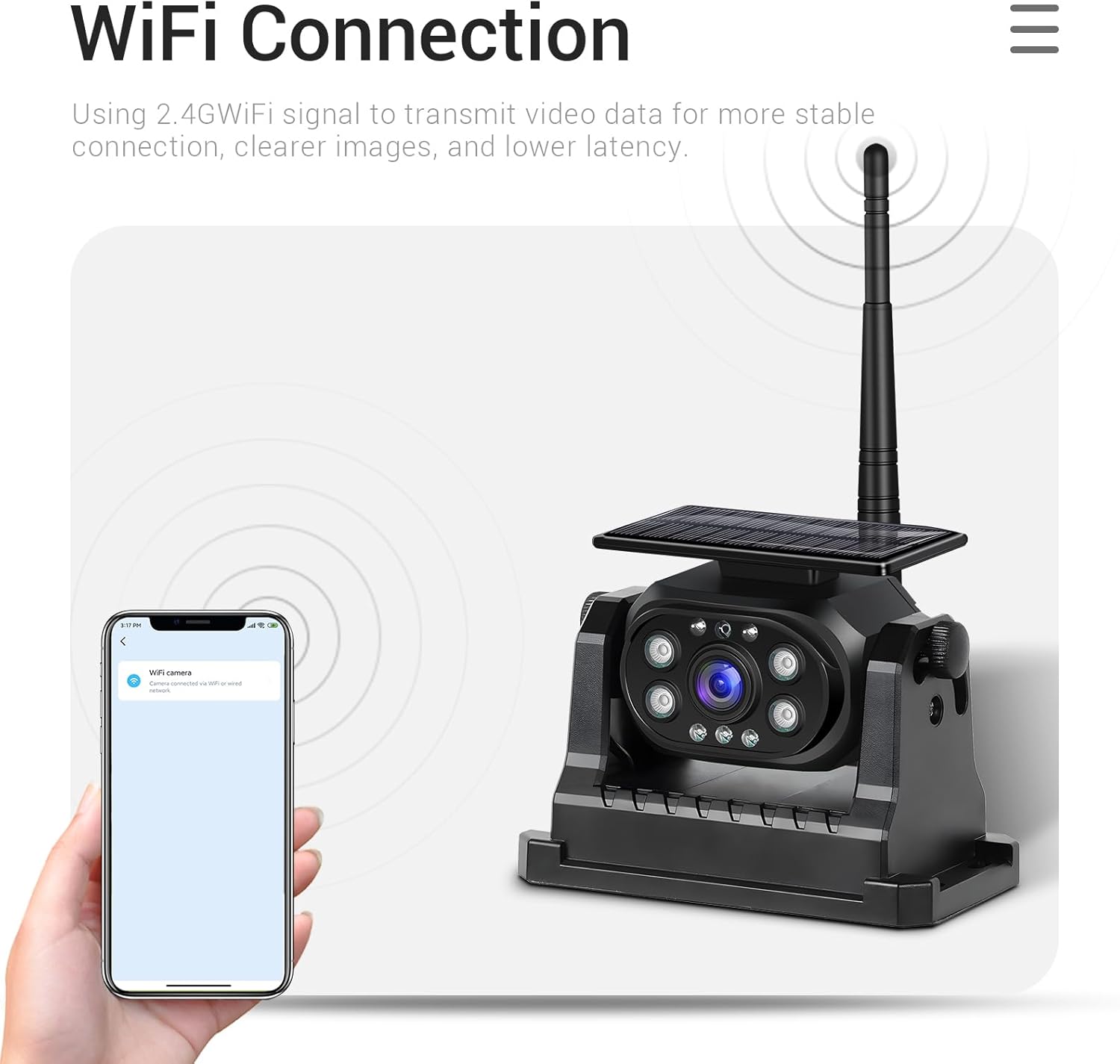 - 【Solar Charge】WiFi backup camera wth built-in Type-C port, the camera can charged via Type-c Cable. Equipped with solar panels, the camera can replenish energy through solar energy