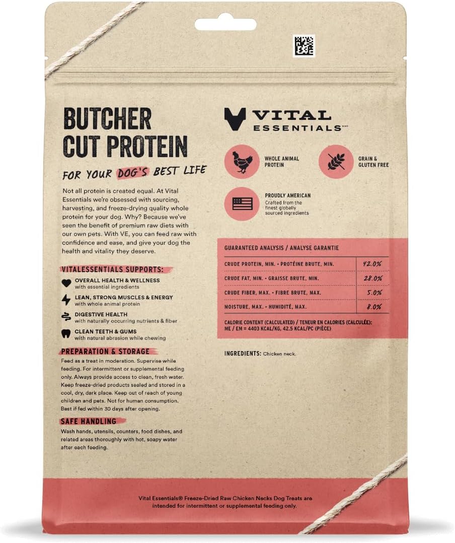 • FREEZE-DRIED RAW CHICKEN NECK DOG TREATS: Vital Essentials Freeze Dried Raw Dog Treats are a high-protein, low calorie treat that can help support your dog's overall health. These treats contain no artificial preservatives or additives. Chicken Neck is the only ingredient.
