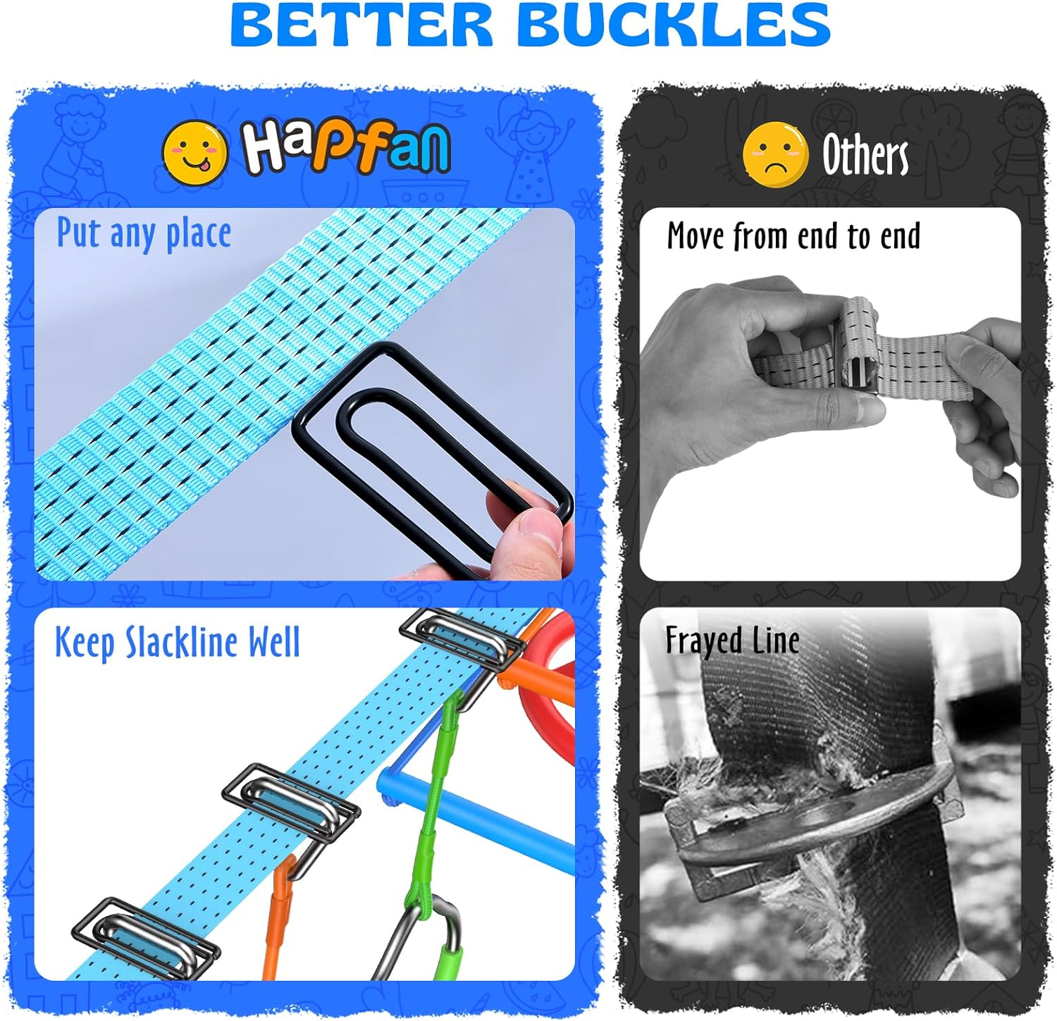 - 【Newly Designed Buckle】Hapfan unique buckle set ensures a quicker setup and enhanced safety without any fraying of the slackline. Easily costomize your own course by adjusting the distance and order of obstacles