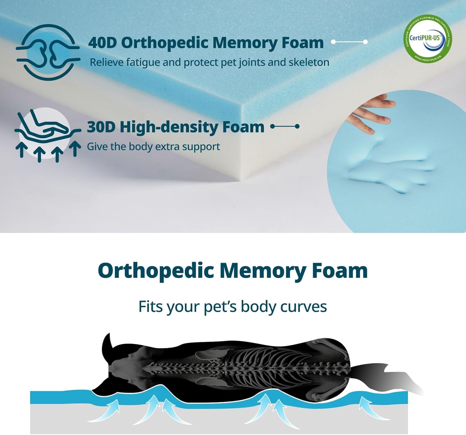 - Orthopedic Memory Foam: Our extra large dog bed uses a combination of 40D memory foam and 30D high-density foam. Evenly distributes weight and conforms to your pet's body, reducing pet stress and protecting joints.