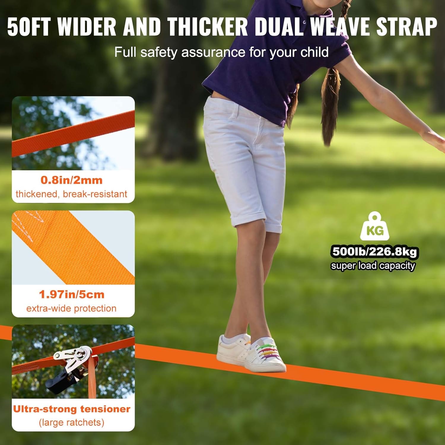 - Safety Design: Each backyard training equipment set can support up to 500 pounds, sufficient for two or more children to use simultaneously. The upgraded die-cast buckle straps, tensioners, and wider, thicker straps solve the issue of sagging ropes, securely locking onto trees to ensure children's feet don’t touch the ground for a worry-free play experience. The double-layer thermoplastic straps ensure the product doesn’t crack, providing a safe and sufficient gripping experience for children.
