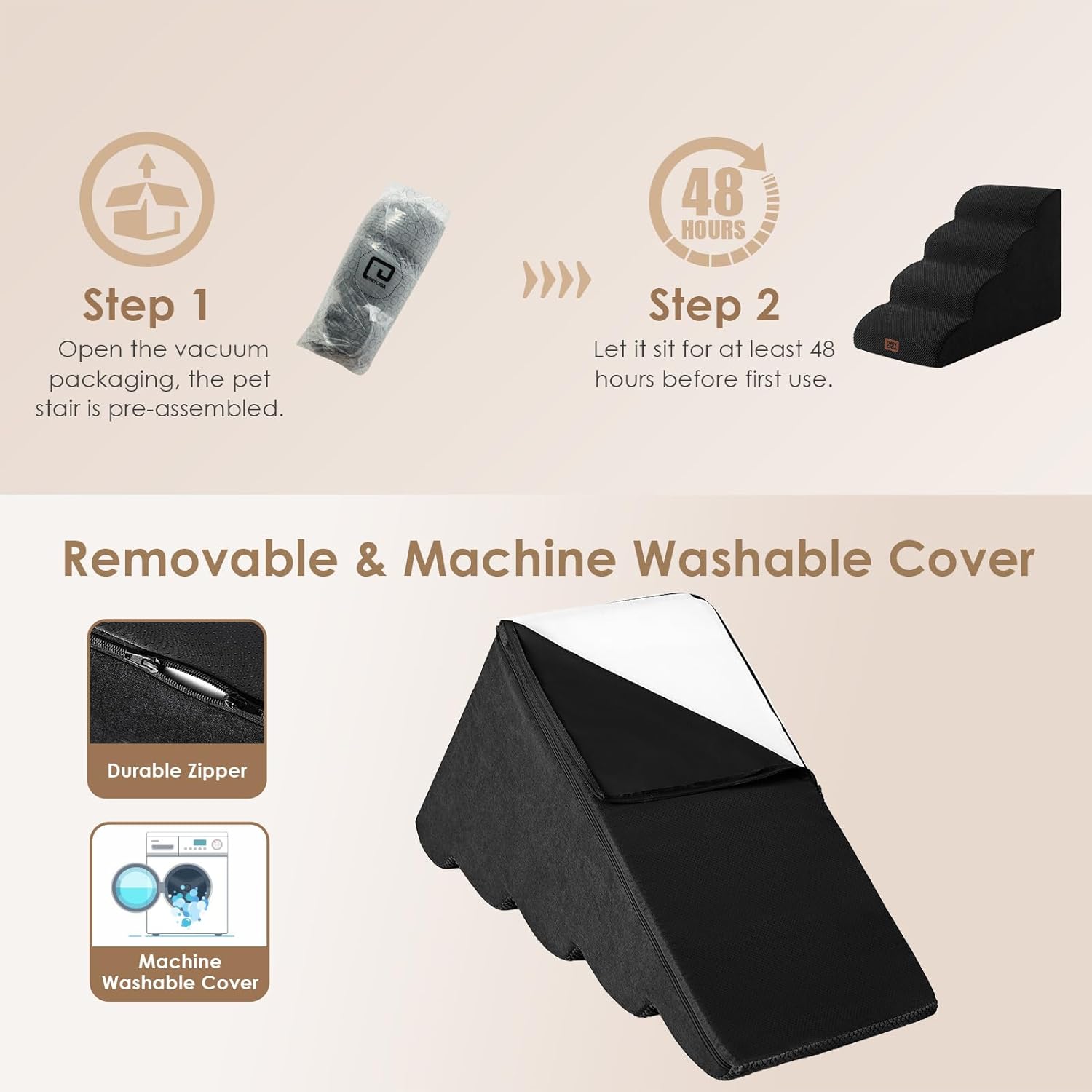 - SPECIFIC AND STEADY DESIGN - 33D density of pure foam make this stair more steady when your pets walk on. The dog bed stairs can provide strong support for pets in the walking process. Low angle slope design can better protect your pet's joints.