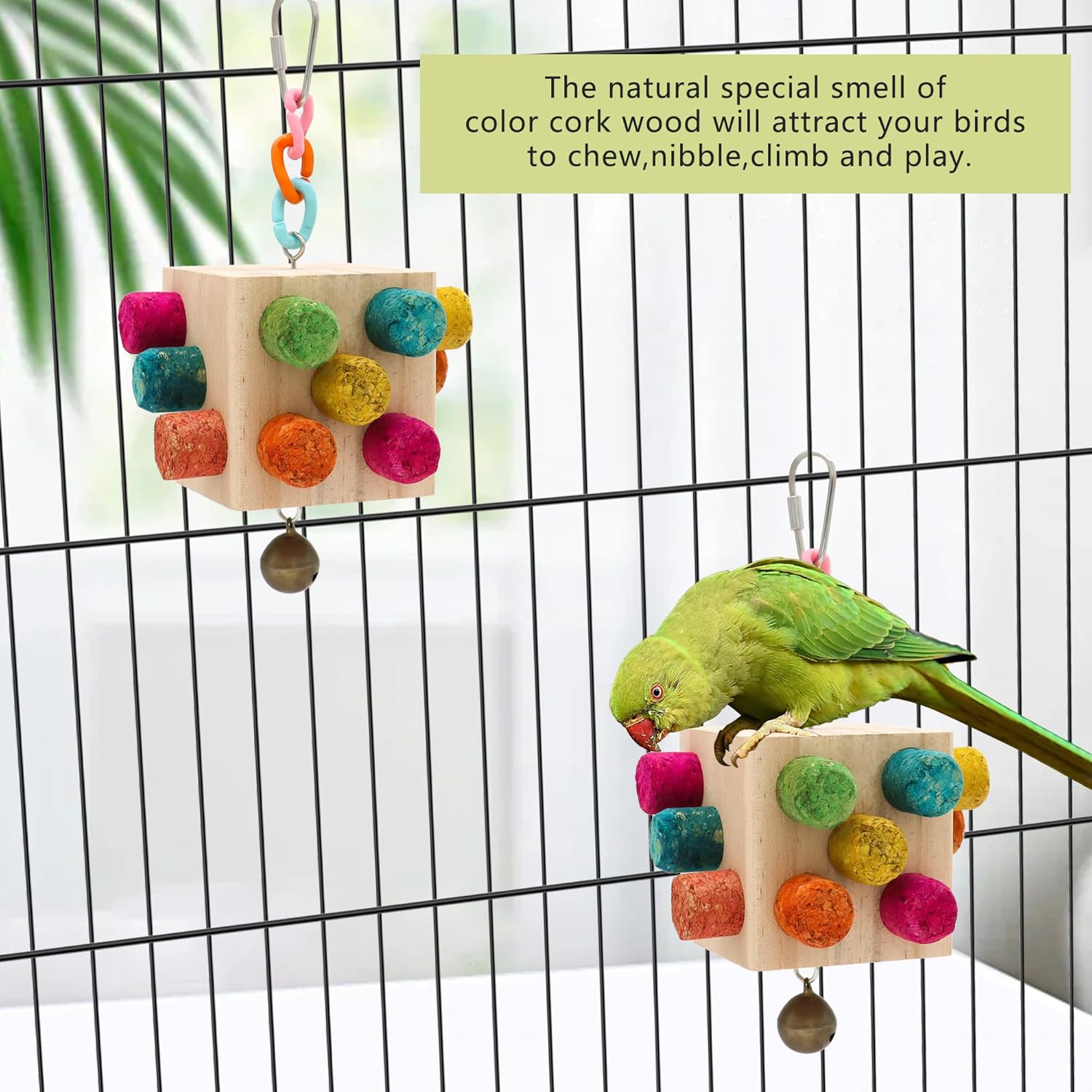 Square Bird Chew Toy, Parrot Cork Stopper Toys Bird Swing Bell Hanging Wooden Puzzle Foraging Toys Small Bird Bite Perch Stand, Small and Medium Parrots (1 Pack-Square Cork Stick)