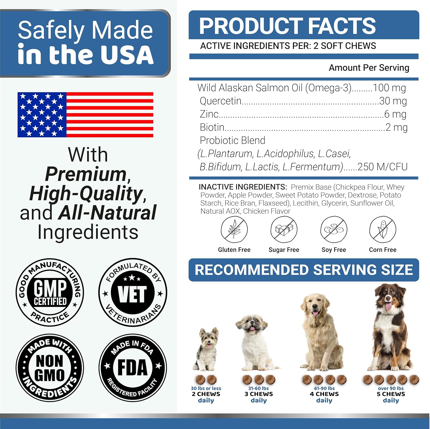 - Premium Omega-Rich Formulation: Loaded with essential fatty acids, DHA, and EPA, our Omega 3 chews for dogs are expertly crafted in the USA to ensure your pet's coat and skin are in prime condition. Skin and coat supplement for dogs