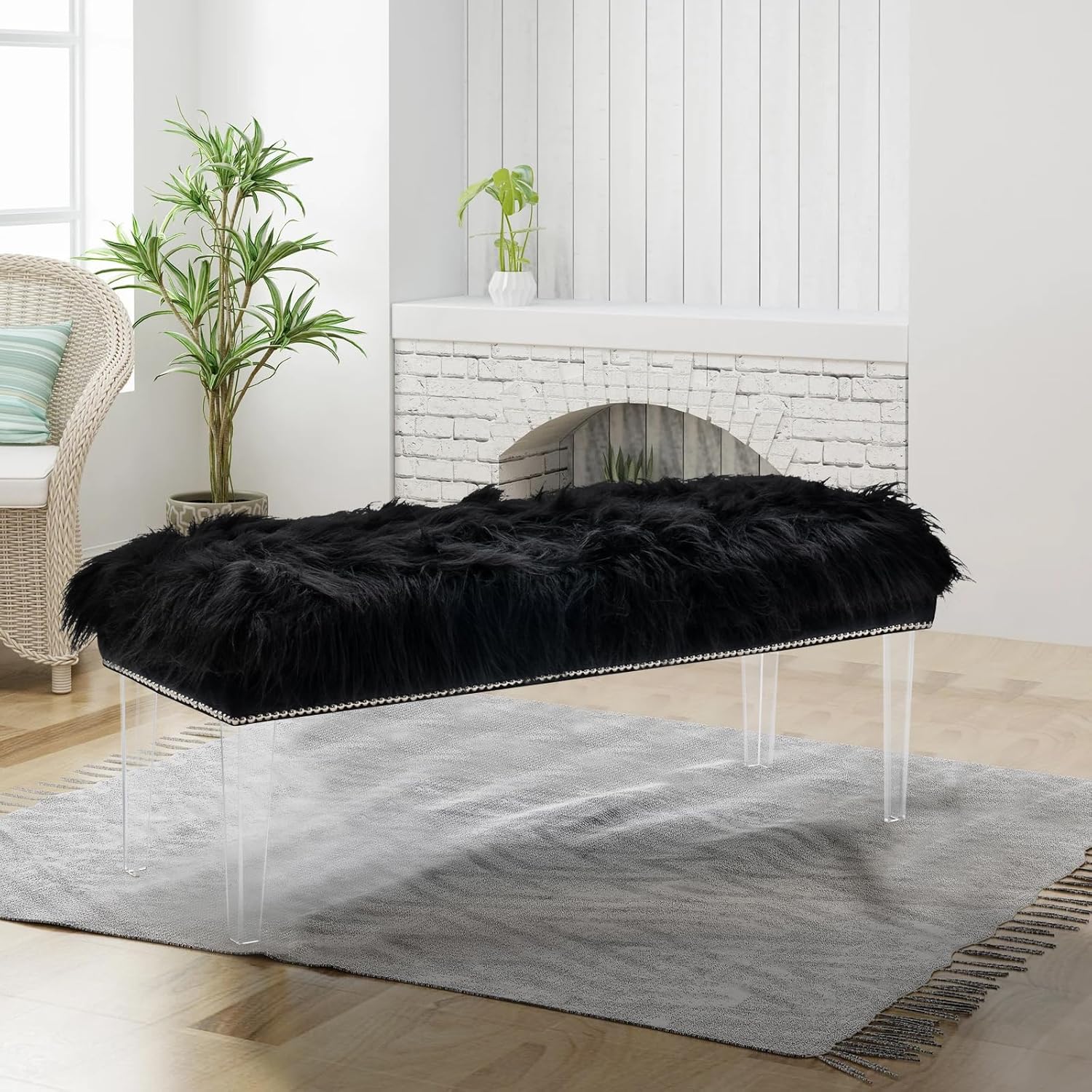 46 Inch Black Bedroom Bench, Benches for Bedroom White Faux Fur Upholstered Bed end Bench, Tufting Bench Indoor Bench with Acrylic Legs for Living Room Bedroom Dining Room Entryway, Black