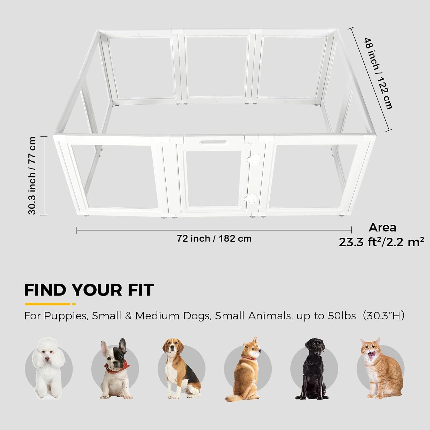 - Durable & Easy to Clean - Our indoor dog pen is made of top quality heavy-duty molded HDPE & Acrylic material, and the base connectors are equipped with strong suction cups to protect flooring and keep the Acrylic Dog Playpen in place and stable. The clear dog play pen is rust-free and paintless, waterproof dust-resistant panels are super easy to clean.