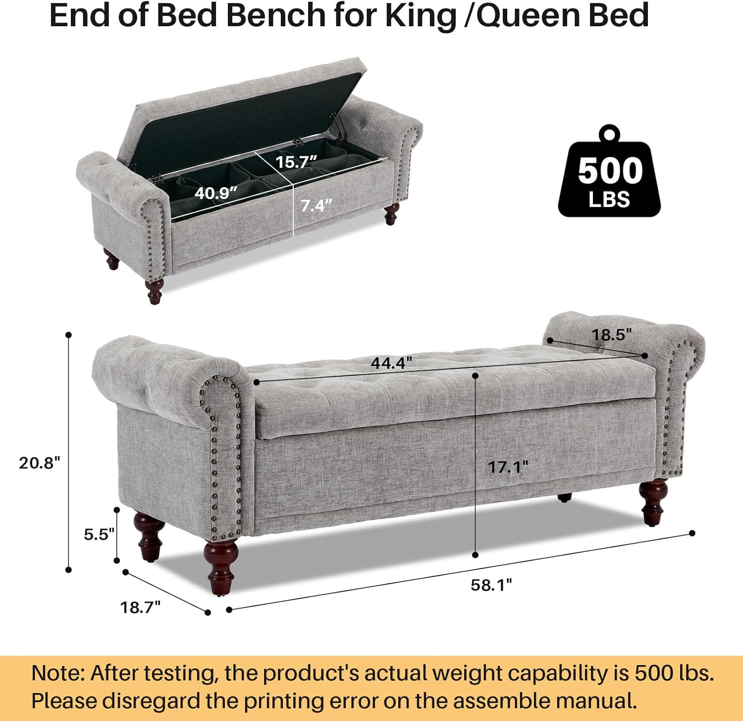 - EASY ASSEMBLY: The This storage bed bench overall size is 58.1" W x 18.7"D x 20.8" H. The cushioned bench is pre-assembled 80% and will come with a manual and installation tools to assemble it, it's simple and convenient.