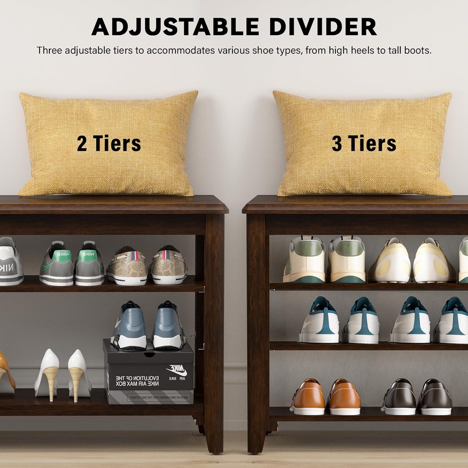 - ADJUSTABLE & REMOVABLE 3 TIERS: The 3-tier design provides ample space to neatly organize and store shoes, keeping your entryway clutter-free. Each shelf is adjustable, typically accommodating up to 4 pairs of shoes. The smaller shelf is suitable for fewer shoes, while the larger shelf offers more storage. All three shelves feature adjustable spacing, allowing you to use two shelves to accommodate taller shoes or store other items easily.