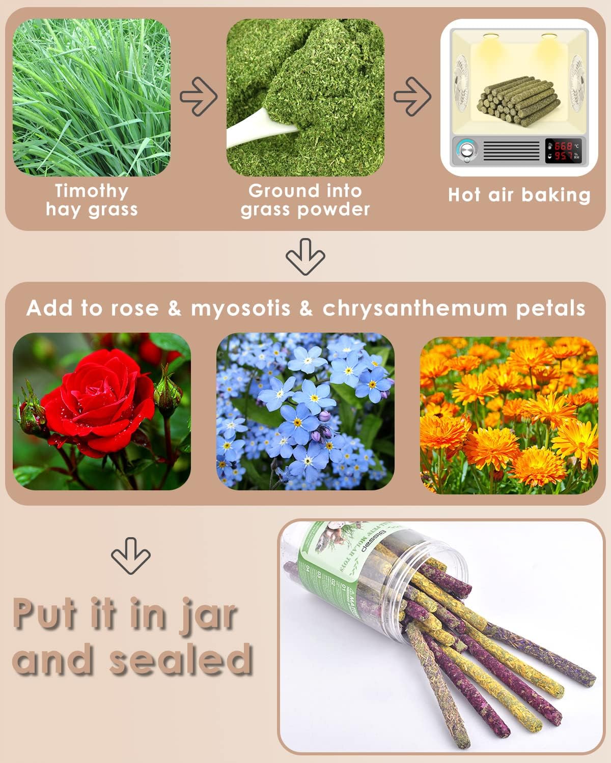 • 4 in 1 Rabbit Treats: 38PCS 3 flavors of the mixed bunny chews set includes Rose, Myosotis, Dahlberg daisy sticks and 38PCS Timothy hay sticks are made of 100% natural organic timothy hay to provide daily energy and fiber. Quality and intriguing select of bunny toys and treats set for your small friends!
