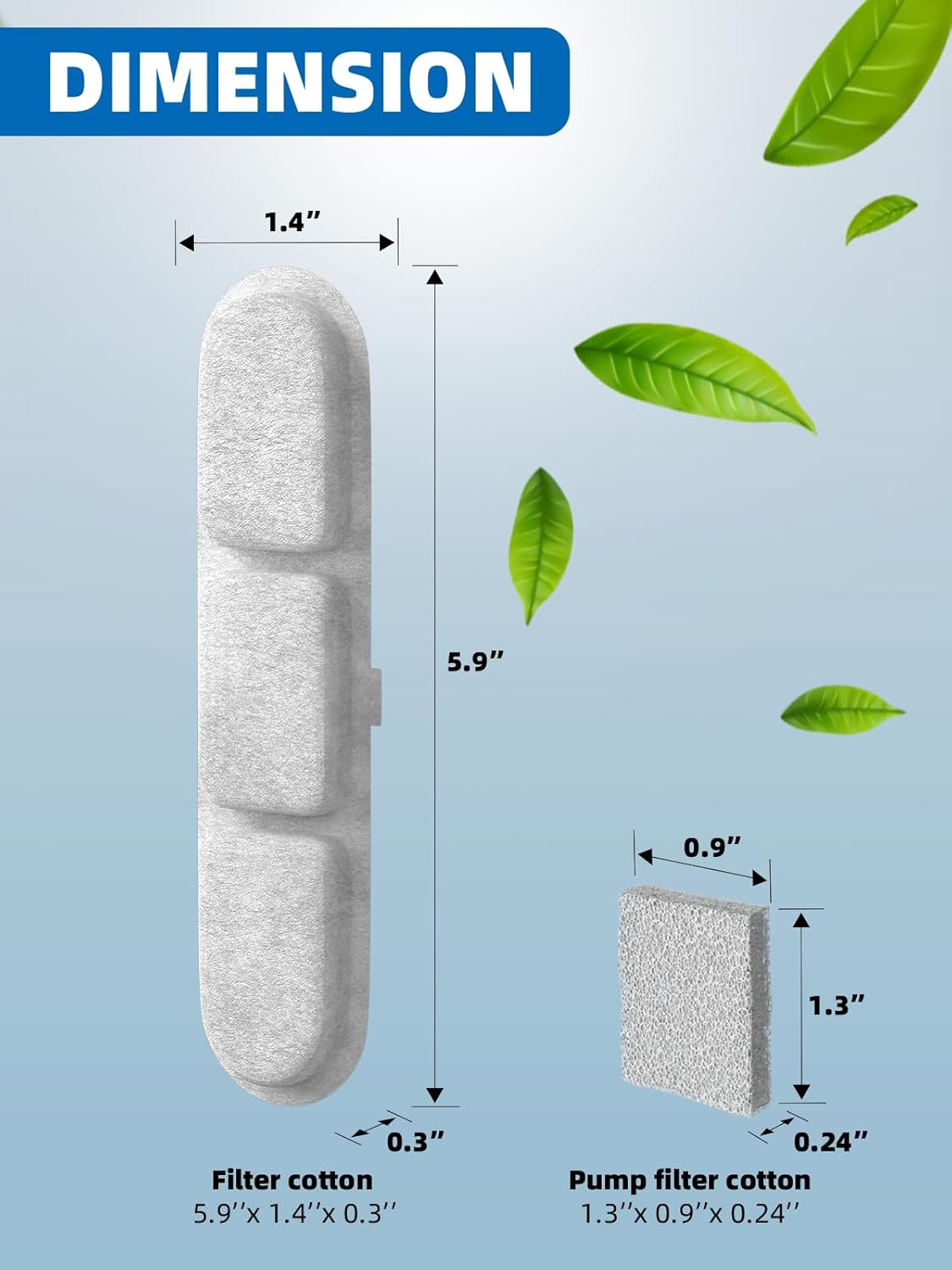 • Specification: The sponge activated carbon filter is rectangular. It is 5 in L x 1.8 in W x 0.4 in H, and it's 6 pet drinking fountain filters & 6 pump sponges in a box, it will serve you well for at least 3 months.