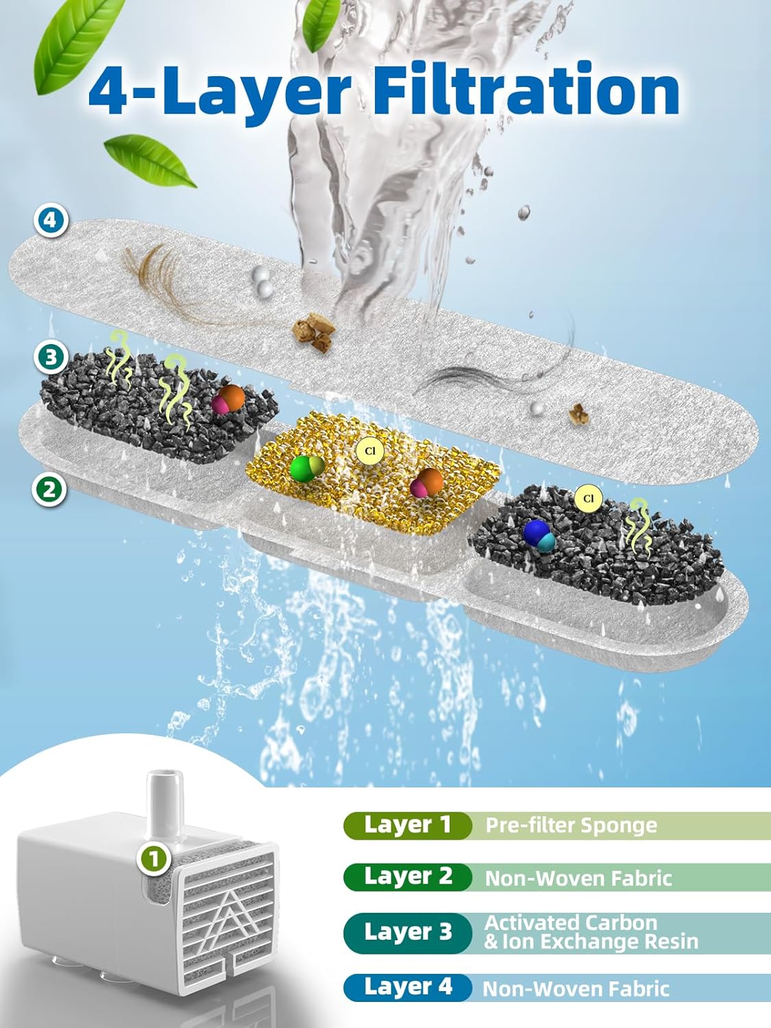 • 4-Layer Filtration System: The stainless steel pet fountain uses 4-layer filtration systems. The carbon filter consists of high-density filter cotton, activated carbon, and ion exchange resin, and there is a pre-filter sponge on the pump. They offer various purification functions, from trapping hair and small debris to softening hard water and filtering out invisible particles, providing pure and healthy water for your pet.