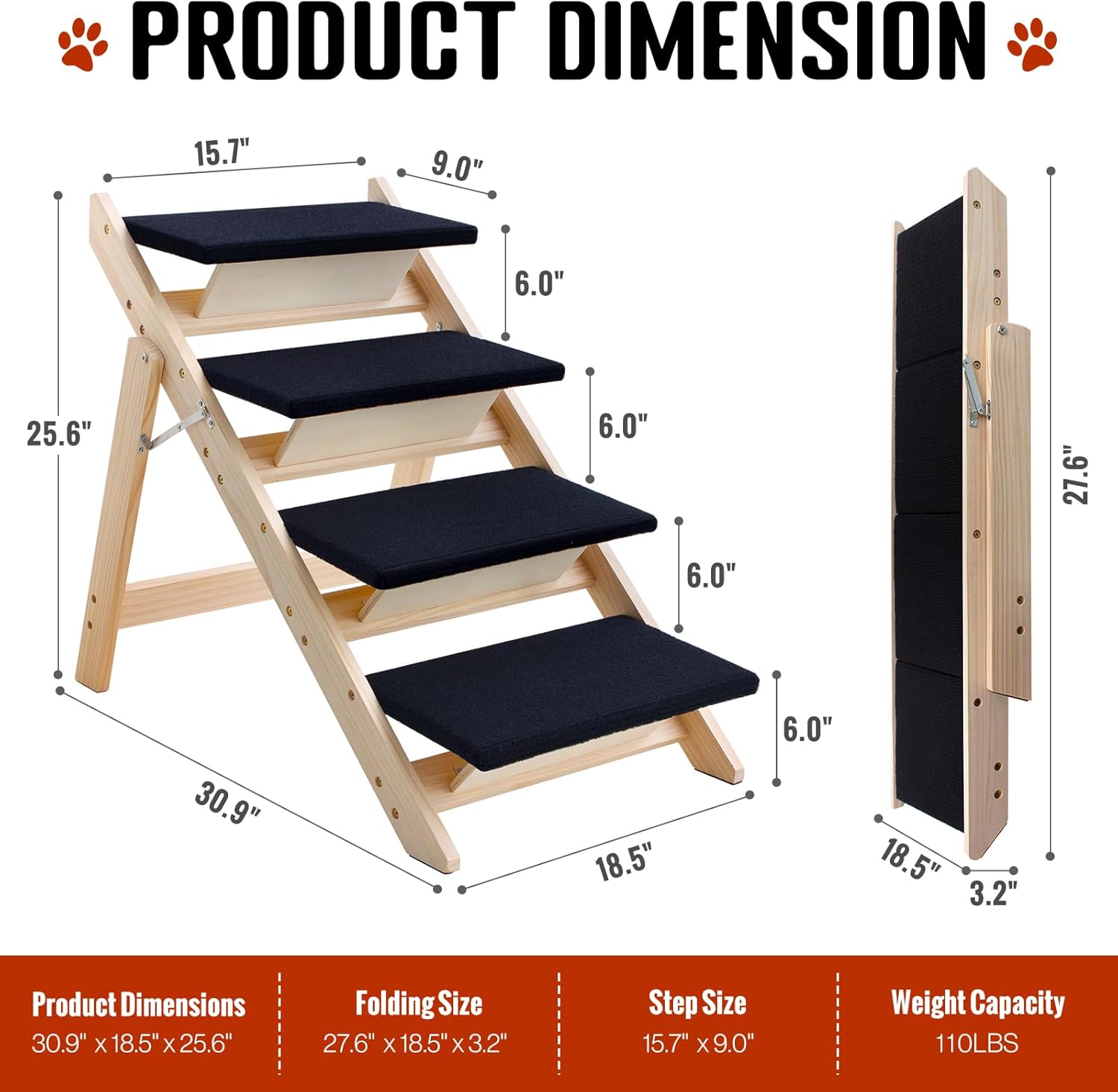 Wood Dog Stairs/Pet Steps, 2-in-1 Foldable Wooden Pet Ramp with Non-Slip Pet Stairs for Small to Medium for Bed,Sofa, Couch, Car, Indoor Pet Dog Cat 4 Steps Stairs Ladder Up to 110 Pounds