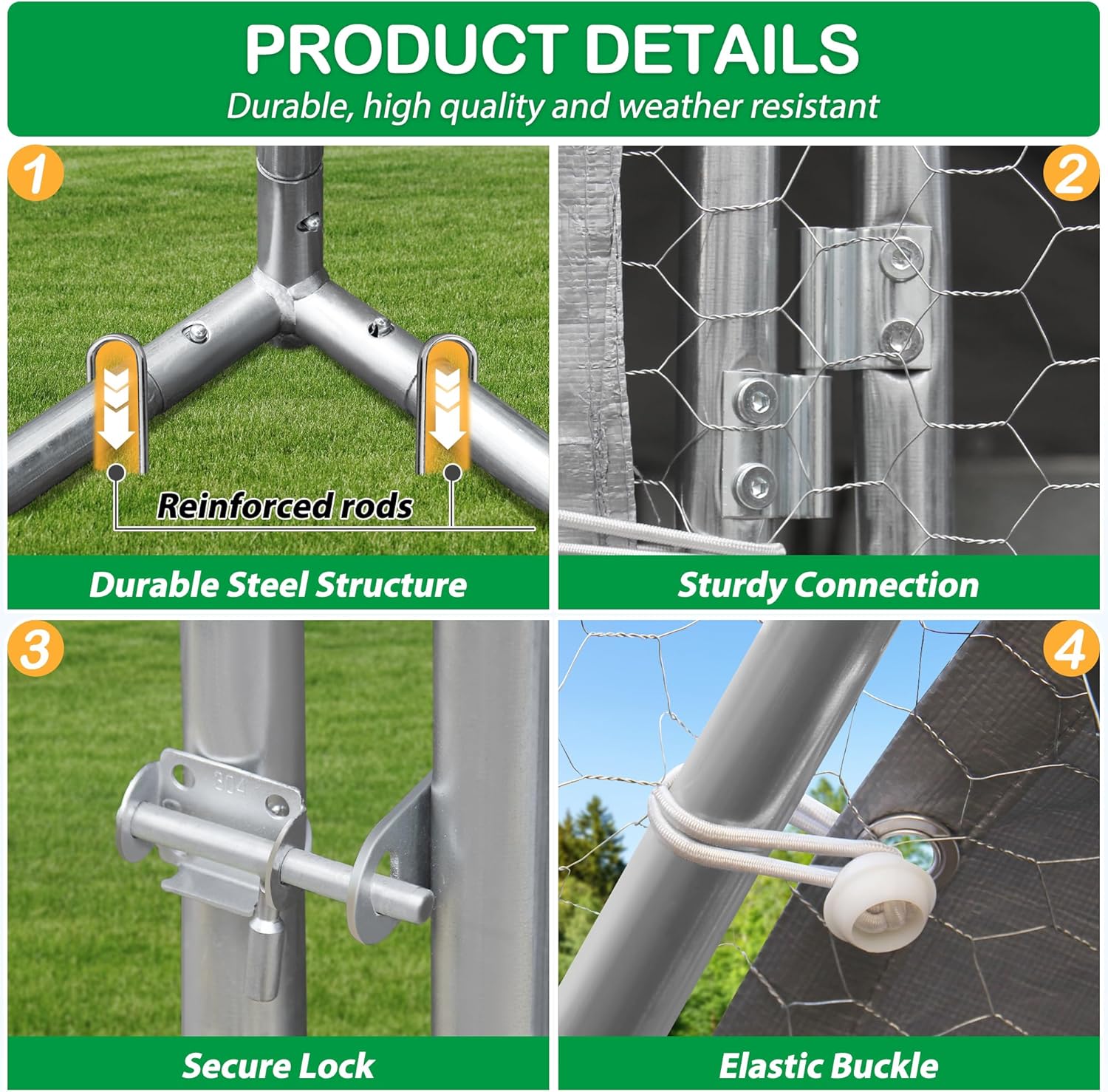 - 🐤MULTIPURPOSE USE: The metal chicken coop run is equipped with a lockable galvanized metal door, not only suitable for raising chickens, but also for raising other poultry such as ducks, rabbits, geese, etc.