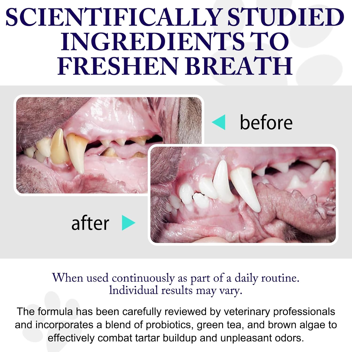 - Next Generation Dental Care - teeth cleaning powder features a proprietary blend of probiotics, revolutionizing oral care for dogs. Say goodbye to the hassle of toothpaste, brushing, and dental sticks with our vet-reviewed, one-scoop dog dental powder.