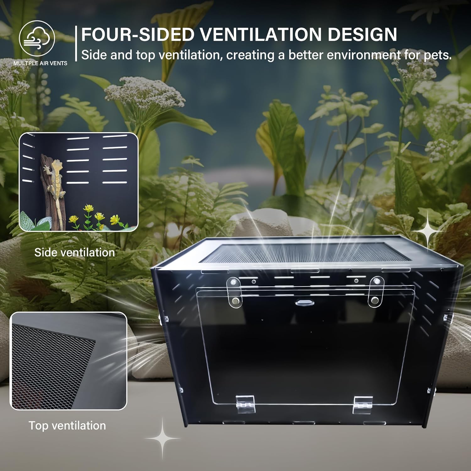 - Transparent Front for Easy Observation of Pet Activity The transparent front panel of this reptile enclosure allows you to easily observe your pets’ behavior and health. Whether it's a jumping spider enclosure or a reptile terrarium, you can always keep an eye on your pets' well-being and make sure they're thriving in a safe and comfortable environment.