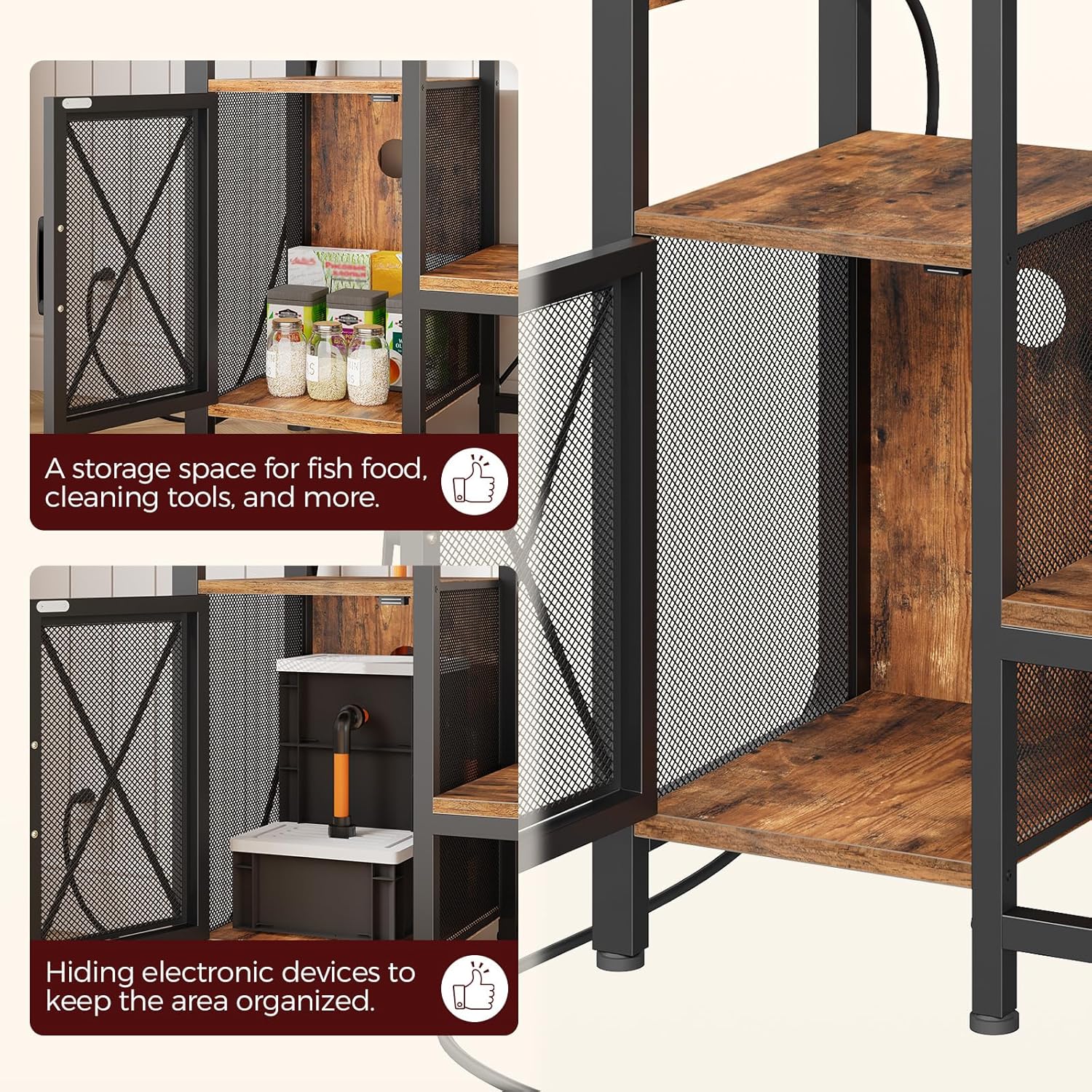 - Ample Storage: The fish tank stand with storage cabinets and shelves provides the right space for filters, tubing, fish food, etc., while the open shelves are functional for displaying accessories. Keep your aquarium area tidy and functional with everything at your fingertip