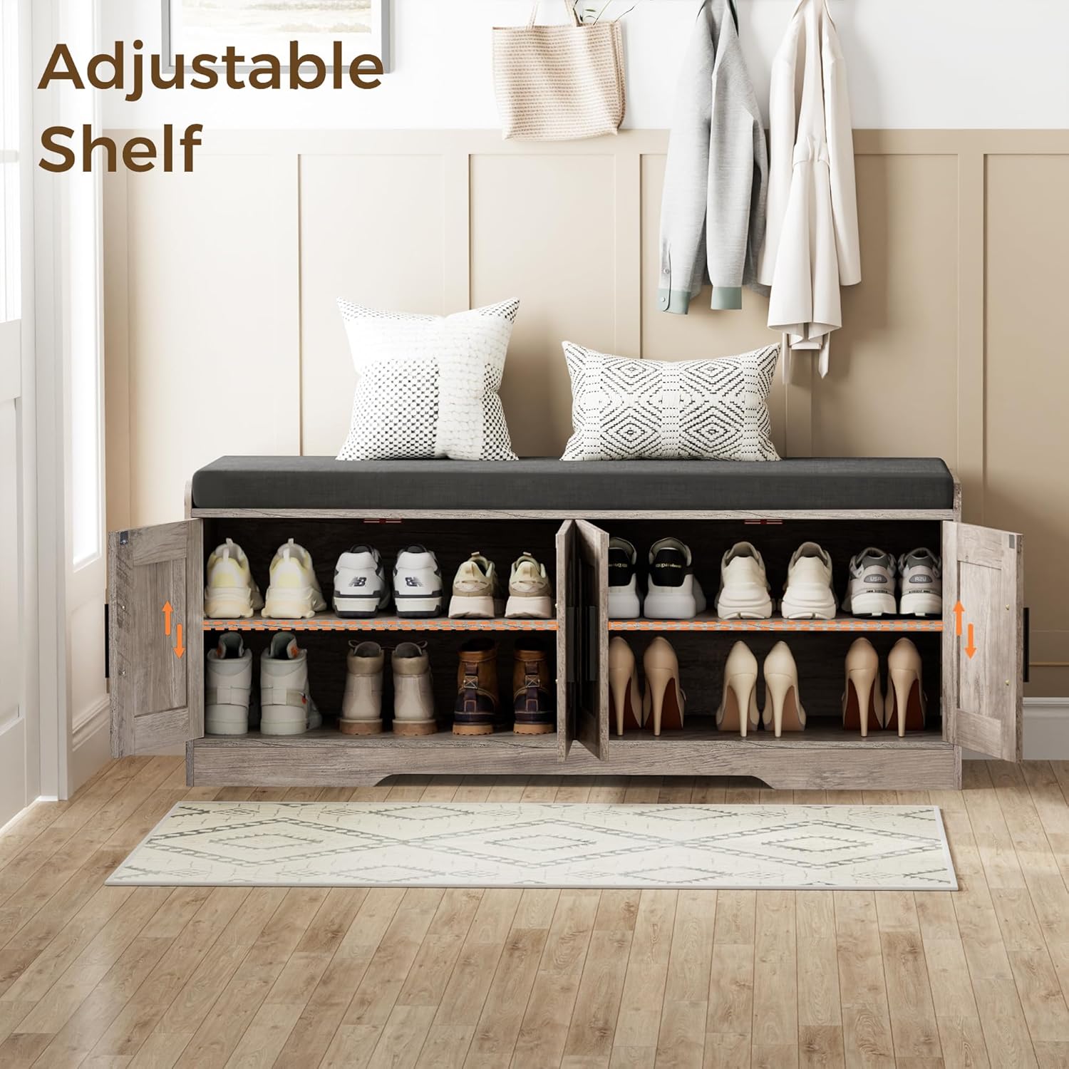 2-Tier Storage Bench, Shoe Bench with Thickened Padded Seat Cushion, Entryway Bench with 4 Doors, Adjustable Shelf, 13.8" D x 45.3" W x 18.5" H, for Entryway, Living Room, Bedroom, Greige