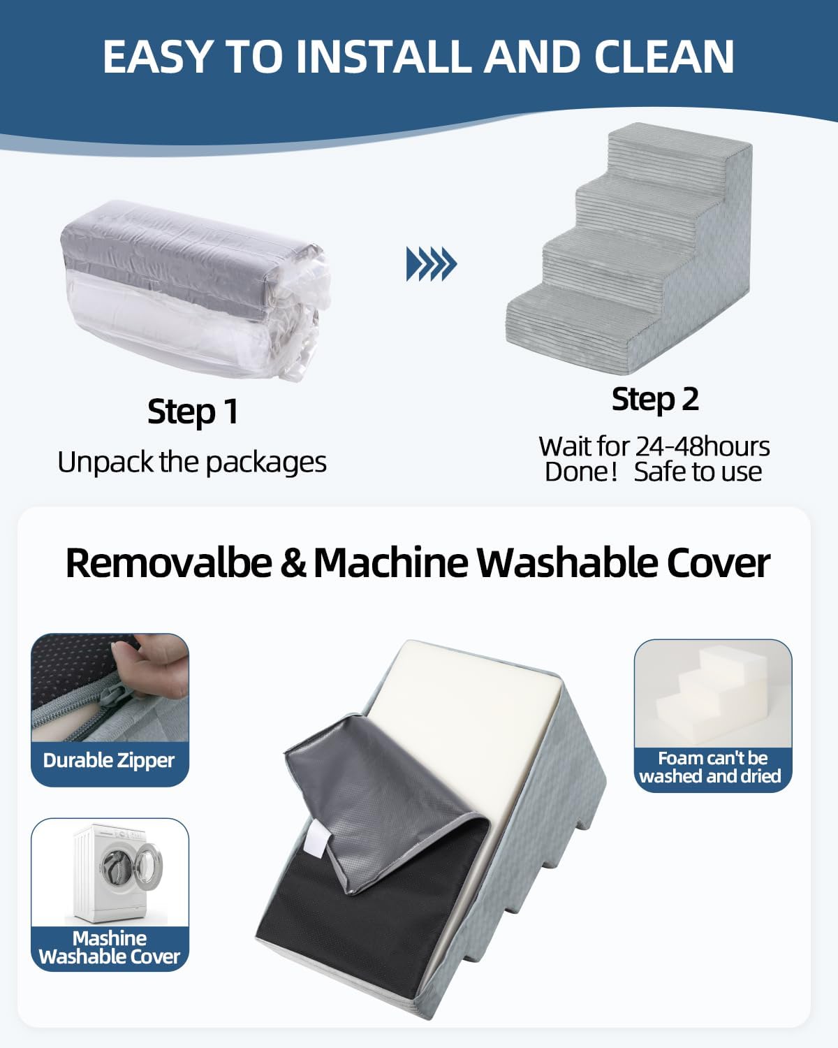 - 【Cleaning Tip】: The pet stairs have a smooth zip for easy removal of the foam core cover. Please note that The inner foam is not washable or dry-cleanable. Just a heads-up: Reassembling the cover after washing will take a little time.