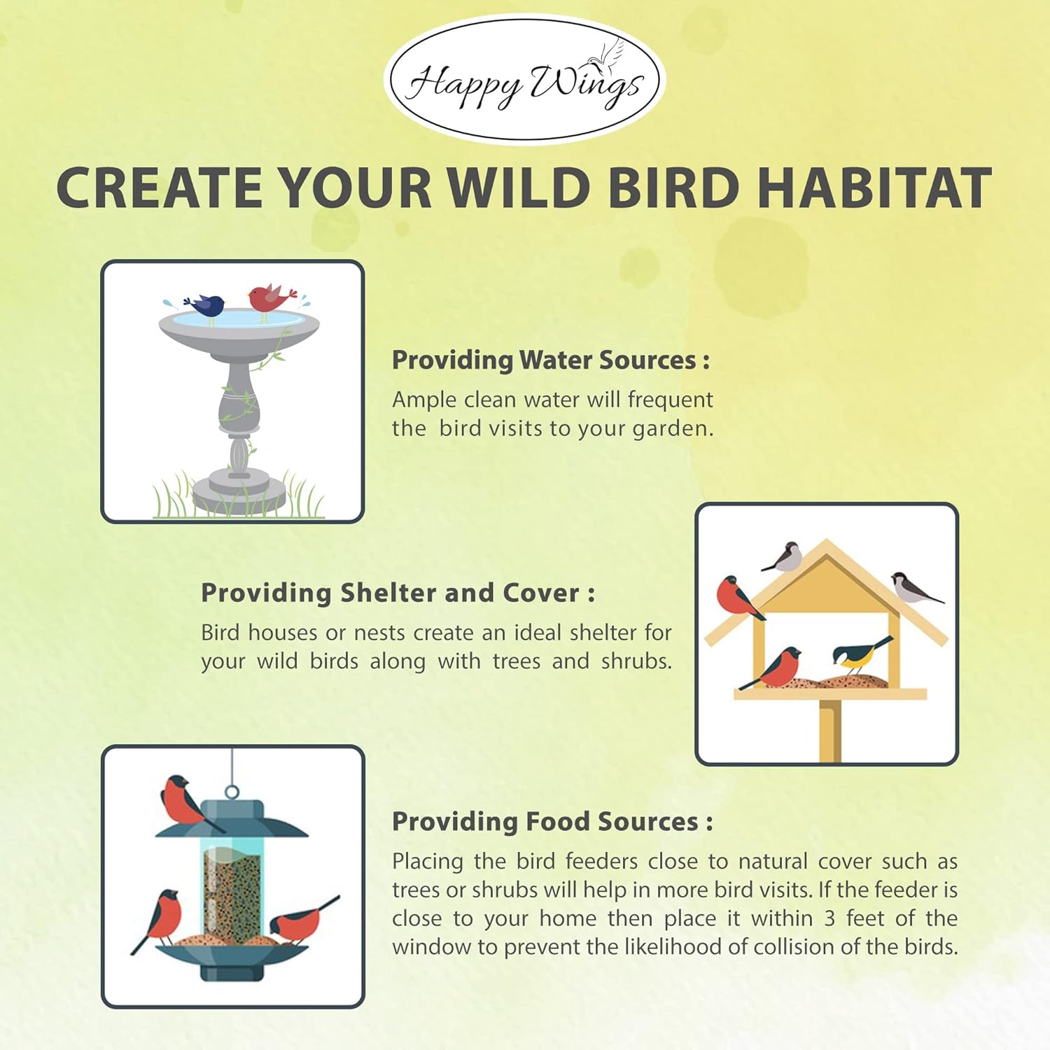 - Happy Wings Wild Bird food are no-grow bird seed which is designed to prevent sprouting, keeping outdoor spaces clean while providing essential nutrition for wild birds.