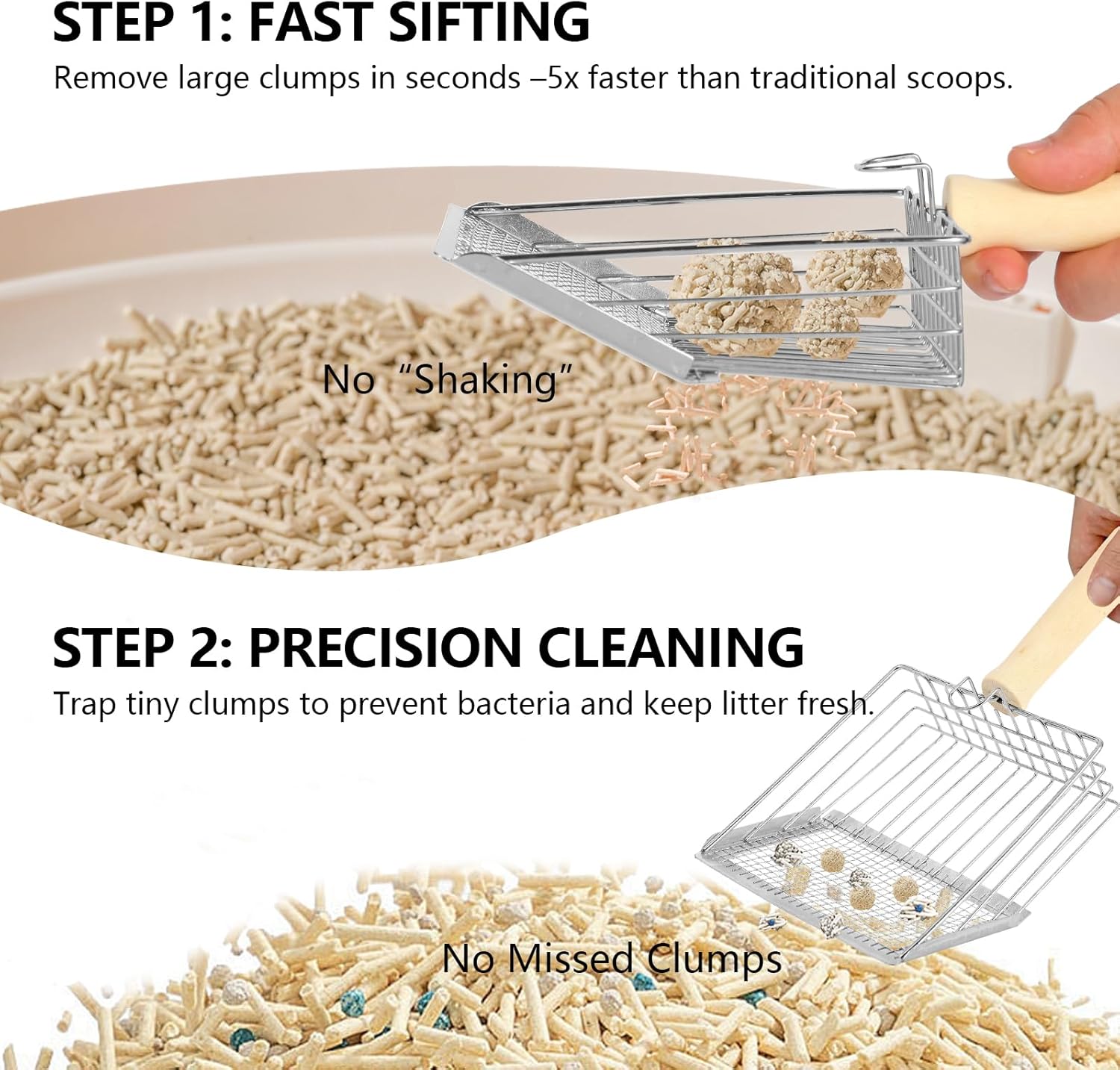 - ★ Comfortable & Ergonomic Design – The upgraded handle is now extra sturdy and won’t loosen over time. Made from solid wood and shaped for a natural grip, this stainless steel cat litter scoop follows ergonomic principles to reduce hand strain, making scooping easier and more comfortable