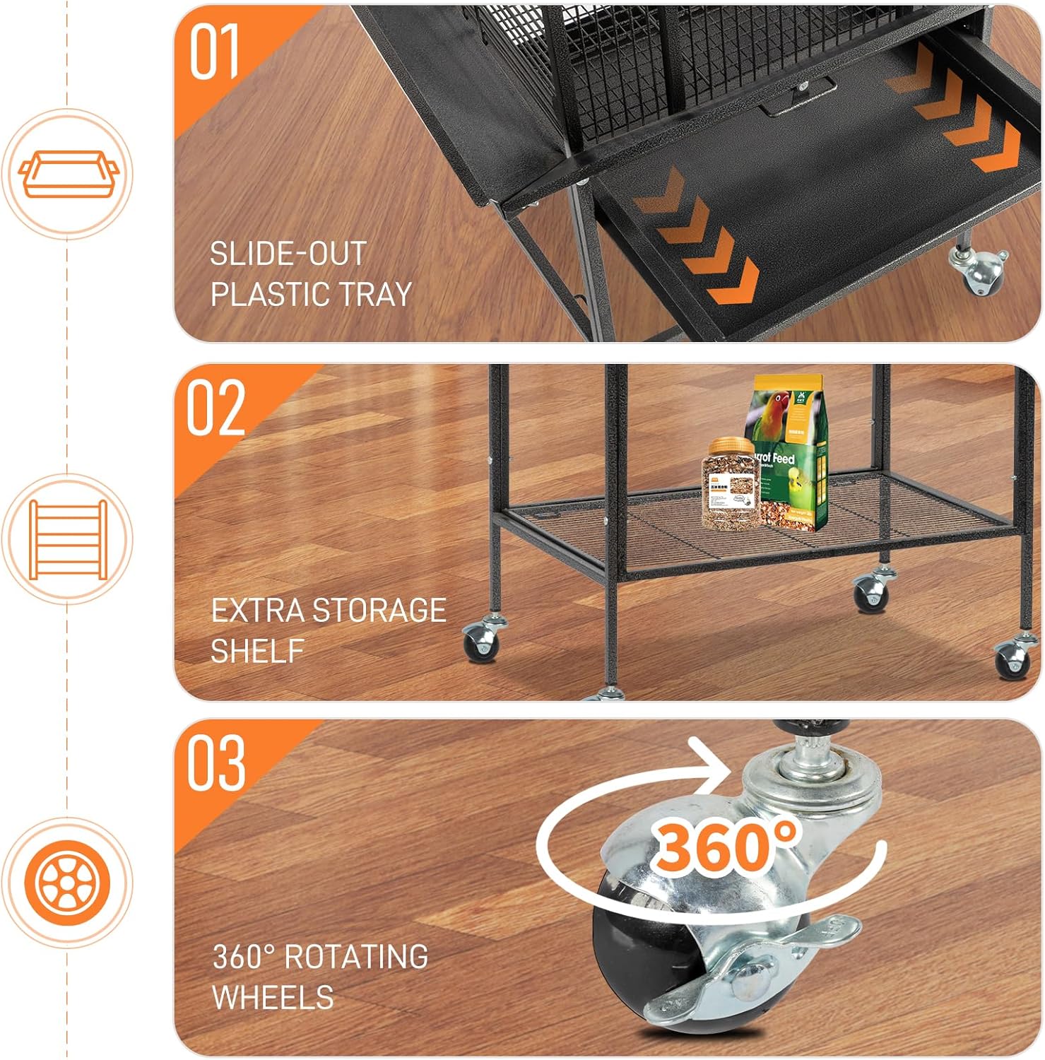 - Effortless Maintenance & Cleanliness: Equipped with slide-out trays and safety metal grille to catch droppings, plus a seed guard to minimize mess. The double tray system makes cleaning quick and effortless.