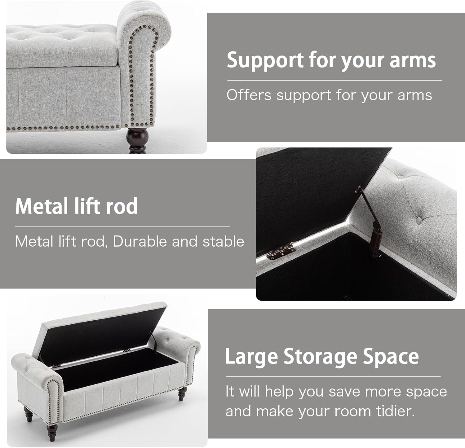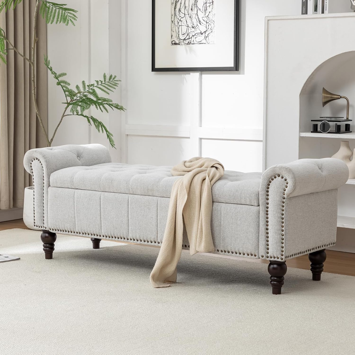 - Graceful Design for Queen-Size Beds: This 58’’ long storage ottoman bench is designed for queen-size beds, featuring delicate nailhead trim, button-tufted upholstery, and rolled arms. Its timeless elegance adds comfort and sophistication, turning the foot of your bed into a serene and stylish retreat.