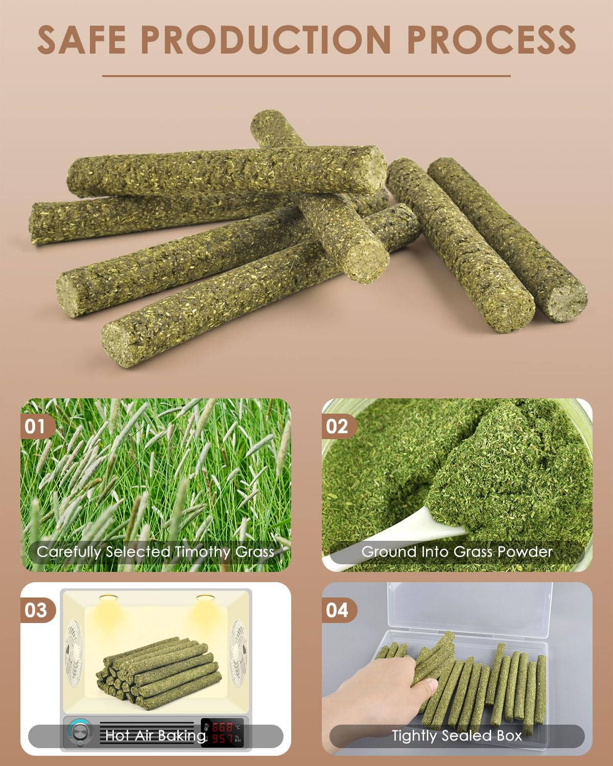 - Natural Timothy Chew Sticks: Timothy grass hay sticks are made of 100% natural organic timothy hay bringing more fibre for your pets and shaped by high temperature ensuring the hardness of sticks to play a better role in teeth grinding