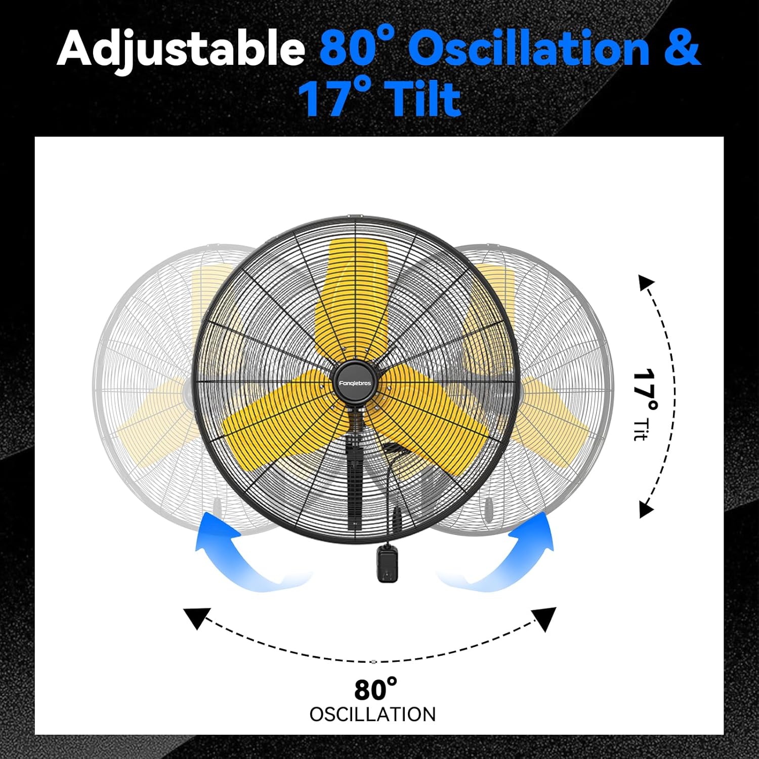 - ๐๐ข๐ฅ๐ญ๐ข๐ง๐ & ๐๐ฌ๐๐ข๐ฅ๐ฅ๐๐ญ๐ข๐ง๐ - The heavy-duty mental wall fan provides an automatic oscillation function of 80 degrees left and right, and the vertical tilt angle can be adjusted up to 17 degrees, helping you easily adjust the wind direction and enjoy the best comfort