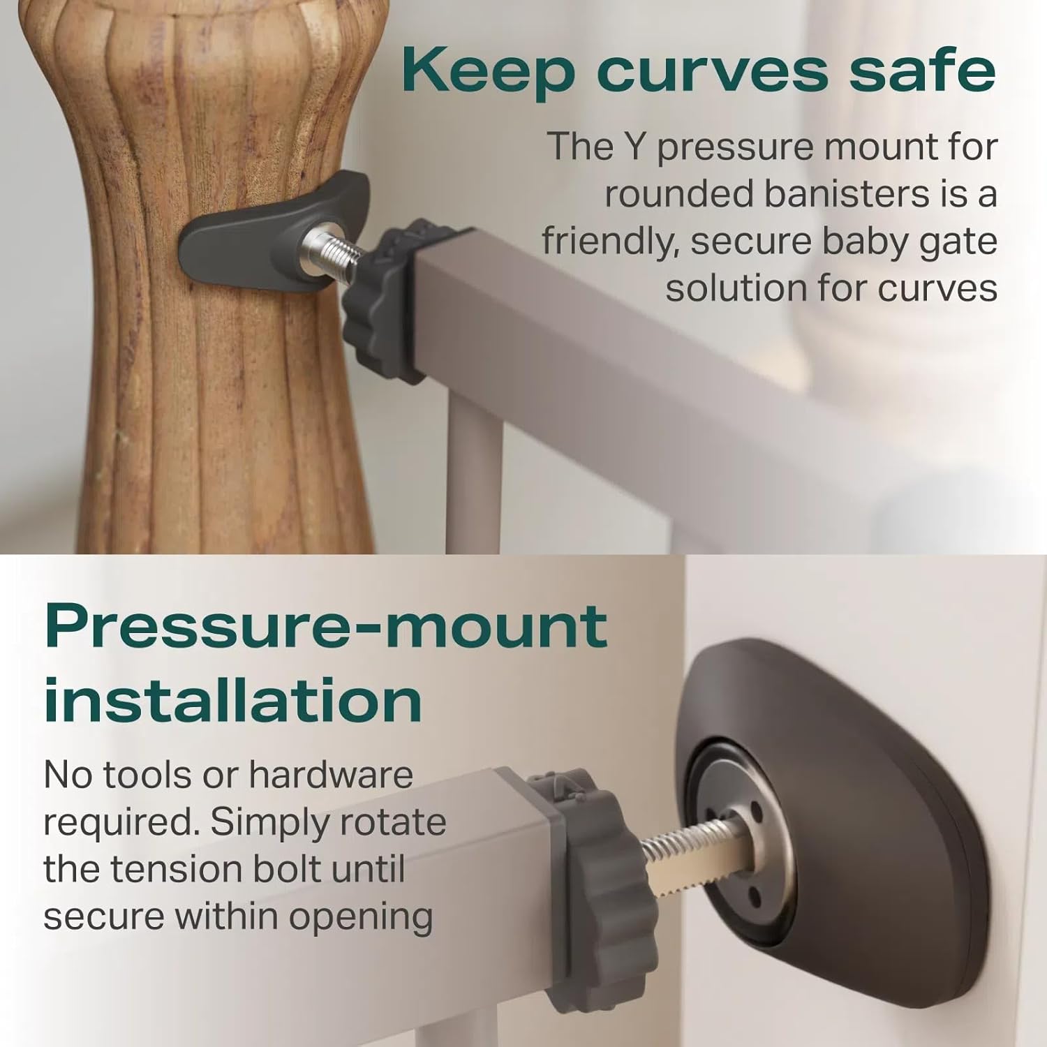 - Two Installation Options: Choose pressure-mounted installation for quick setup with no wall damage—strong enough to withstand up to 150 lbs of force. For stairs or high-impact areas, opt for hardware mounting, which holds over 210 lbs for added security.
