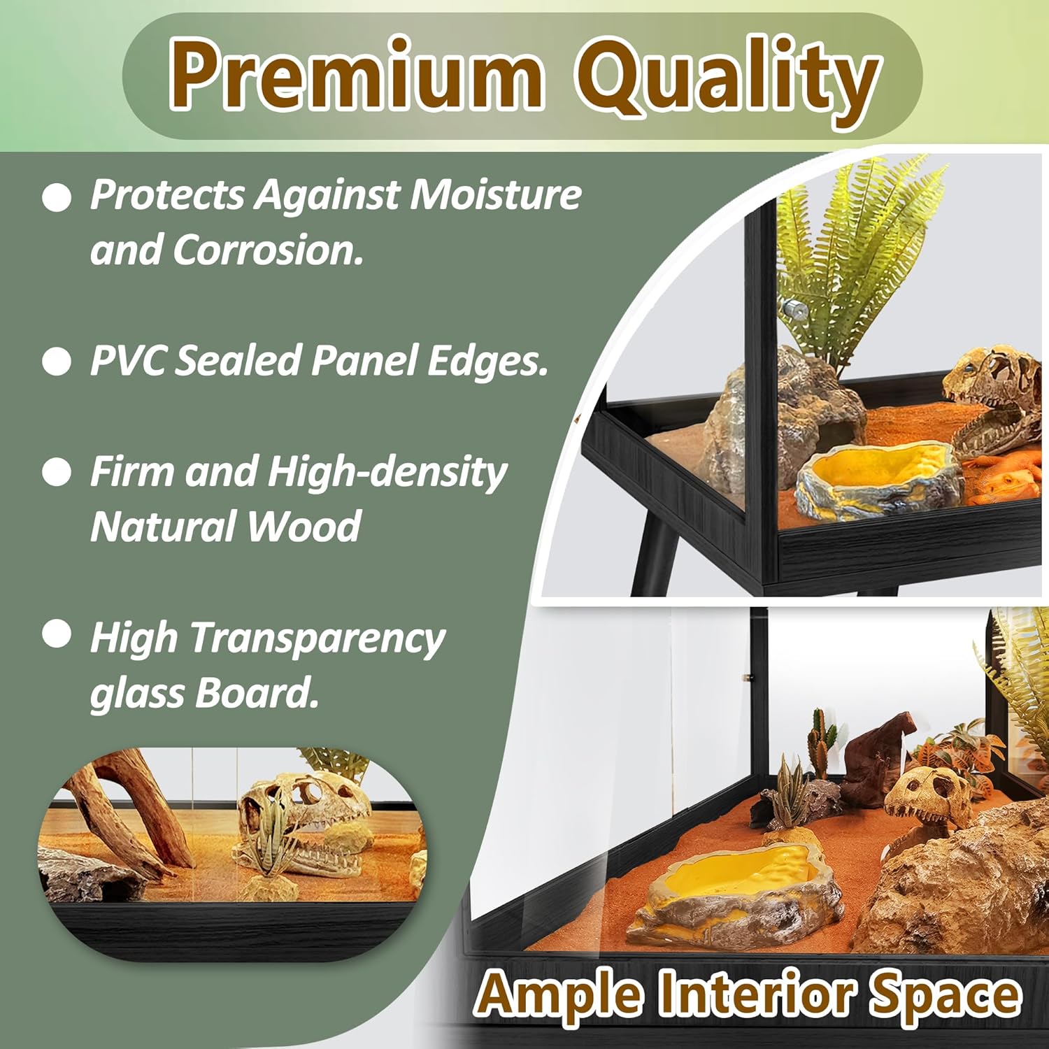 • 【High-Quality Reptile Habitat】Designed for reptile enthusiasts who seek a dependable and comfortable space for their pets, this high-quality habitat is crafted from sturdy solid wood treated with water-repellent coatings on both sides. It's ideal for terrestrial reptiles such as bearded dragons, snakes and tortoise , providing a dry and stable environment for daily activity. Please note: this cage is not intended for aquatic use.