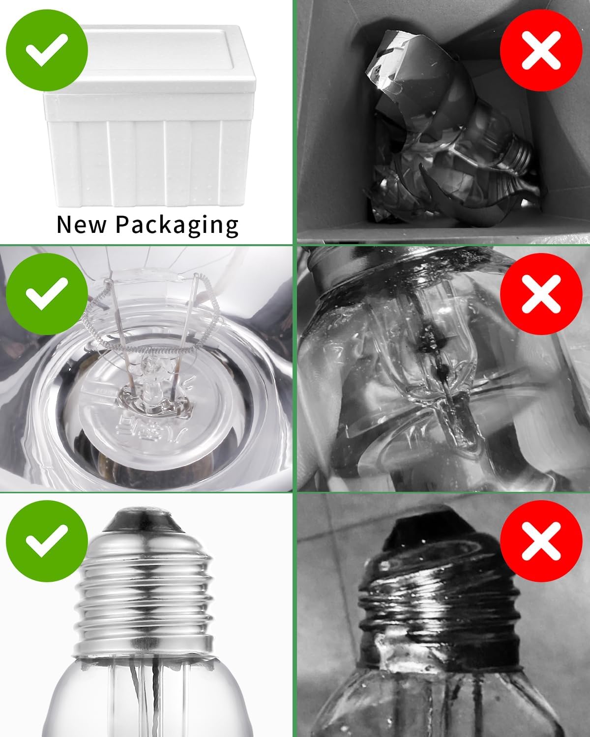 - Safety Tip: Featuring a standard E26 base (1.02''), this incandescent light bulb is easy to install and compatible with most fixtures. For safe operation, maintain a safe distance, avoid contact with hot surfaces, and ensure the bulb is not exposed to water or unstable voltage.
