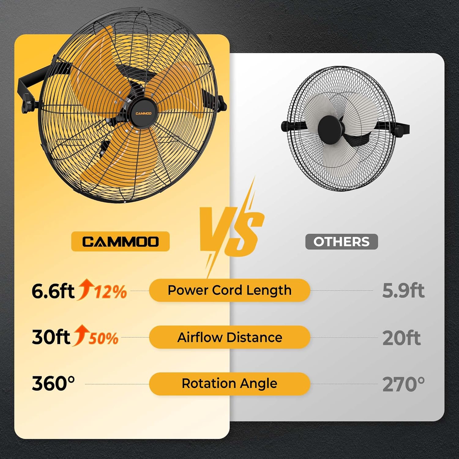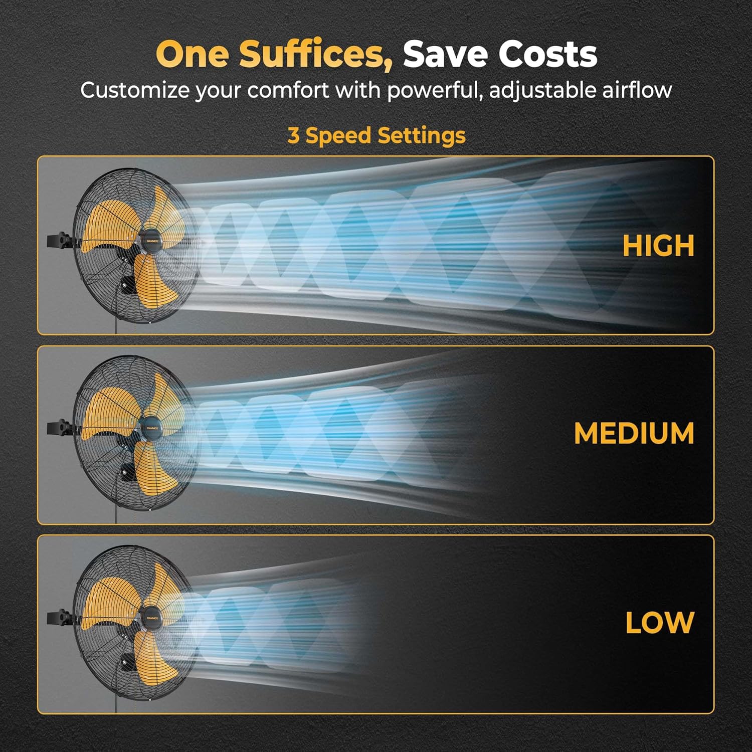 • Effortless Control with Extended Reach:Featuring a 6.6 ft power cord (12% longer than others), this wall mount fan effortlessly covers most distance needs, allowing you to enjoy cool airflow without extra wiring hassle. Ideal for industrial fan setups prioritizing convenience and flexible placement.