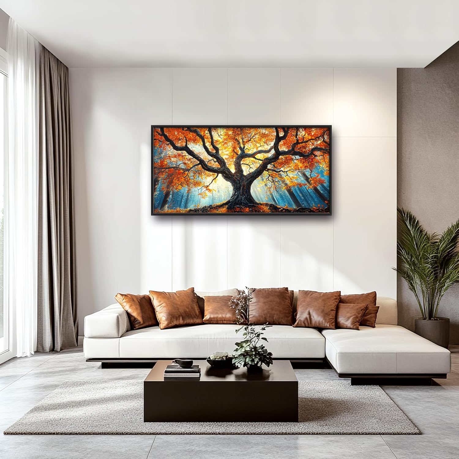 - 【Unique Design】 Oil painting of an autumn tree with thick branches and a wide trunk, surrounded by vibrant orange leaves, set against the backdrop of a forest in full bloom, with rays of light piercing through the foliage.