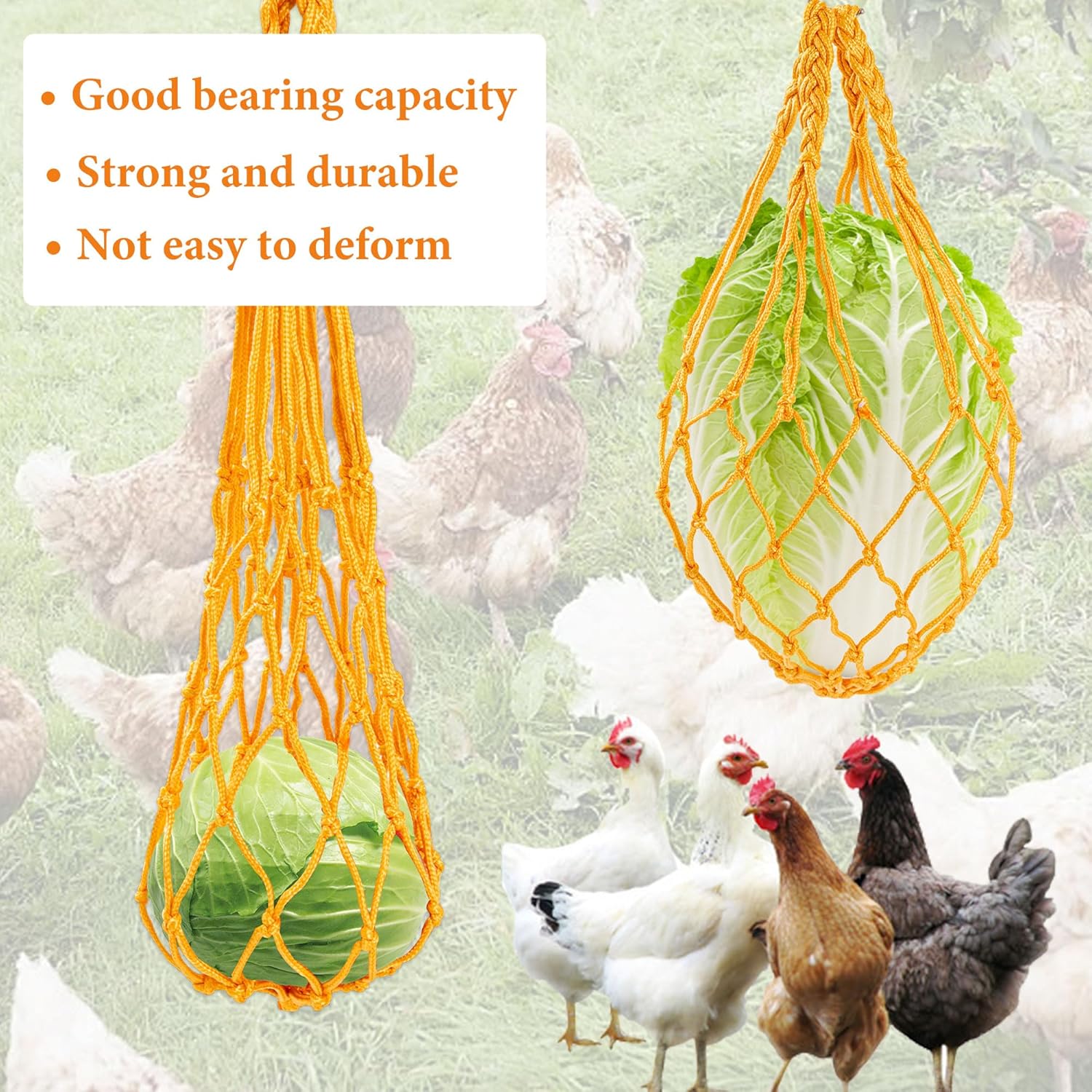 - Hanging vegetable Feeder: Our heavy-duty nylon chicken feeders (20.5" long) make snack time fun! The mesh design holds veggies securely while encouraging natural foraging behavior. Easy to clean and helps maintain coop cleanliness between meals.