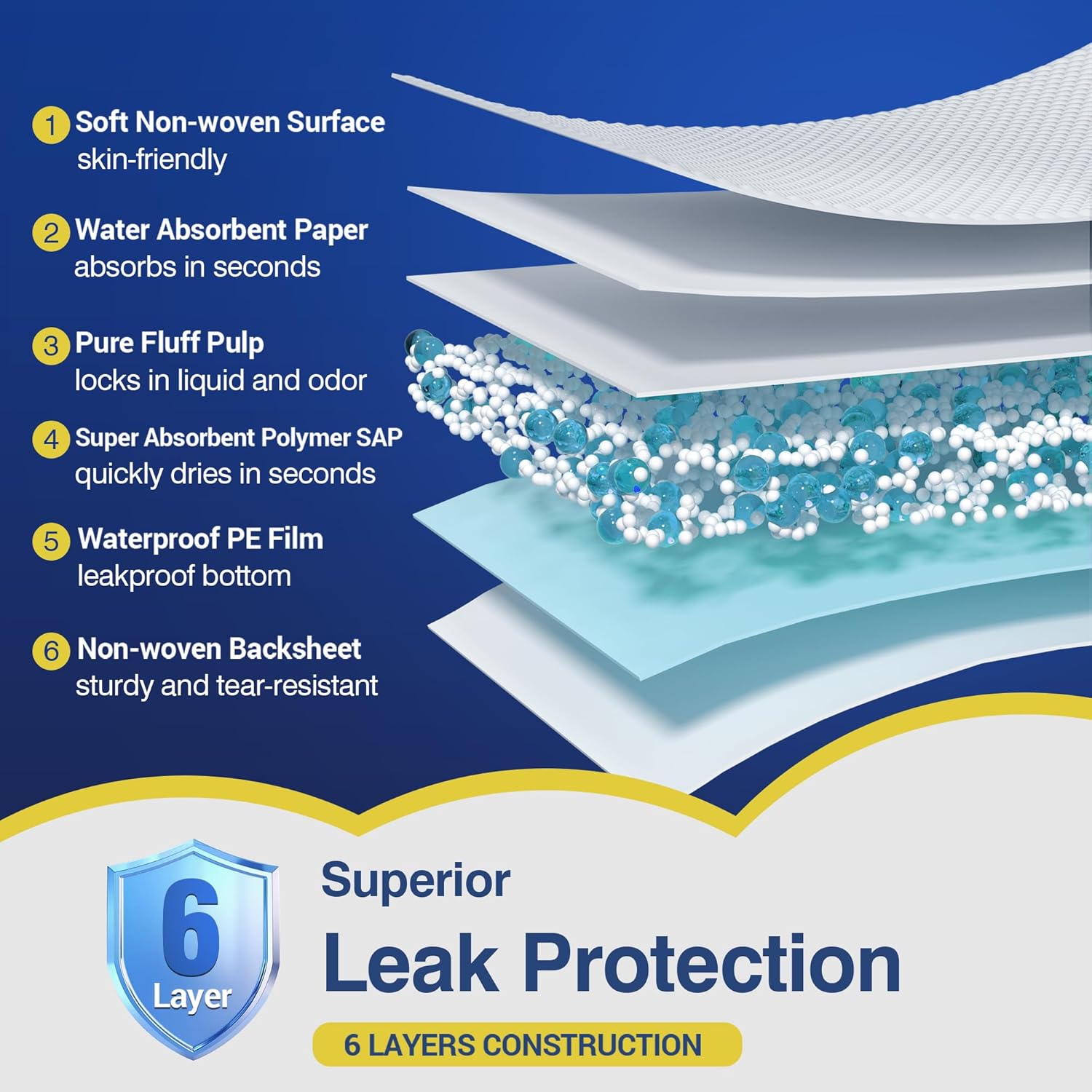 - Unmatched Leak Protection - Our 6-layer construction features a soft top sheet, super-absorbent core, and a waterproof backing. This powerful combination locks in moisture, preventing leaks from reaching your mattress, furniture, or wheelchair cushion. Enjoy peace of mind and a dry, protected surface throughout the night or day.
