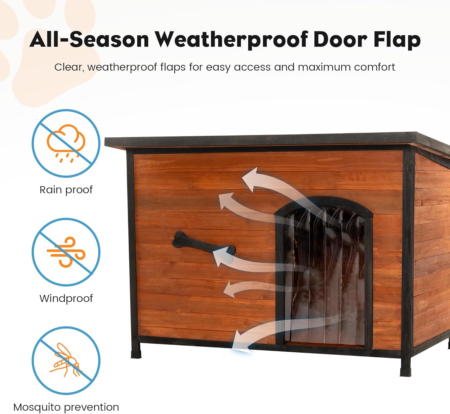 - [Specially Designed for Outdoor Use] The sloping asphalt roof is expertly engineered to prevent rainwater from pooling, ensuring that your pet's living space remains dry and comfortable. The floor is 2.4โโ above the ground, and there is a removable PVC curtain and adaptable floor pads for uneven ground. This design enables the dog house to withstand harsh weather conditions, preventing water from seeping in and materials from getting damp