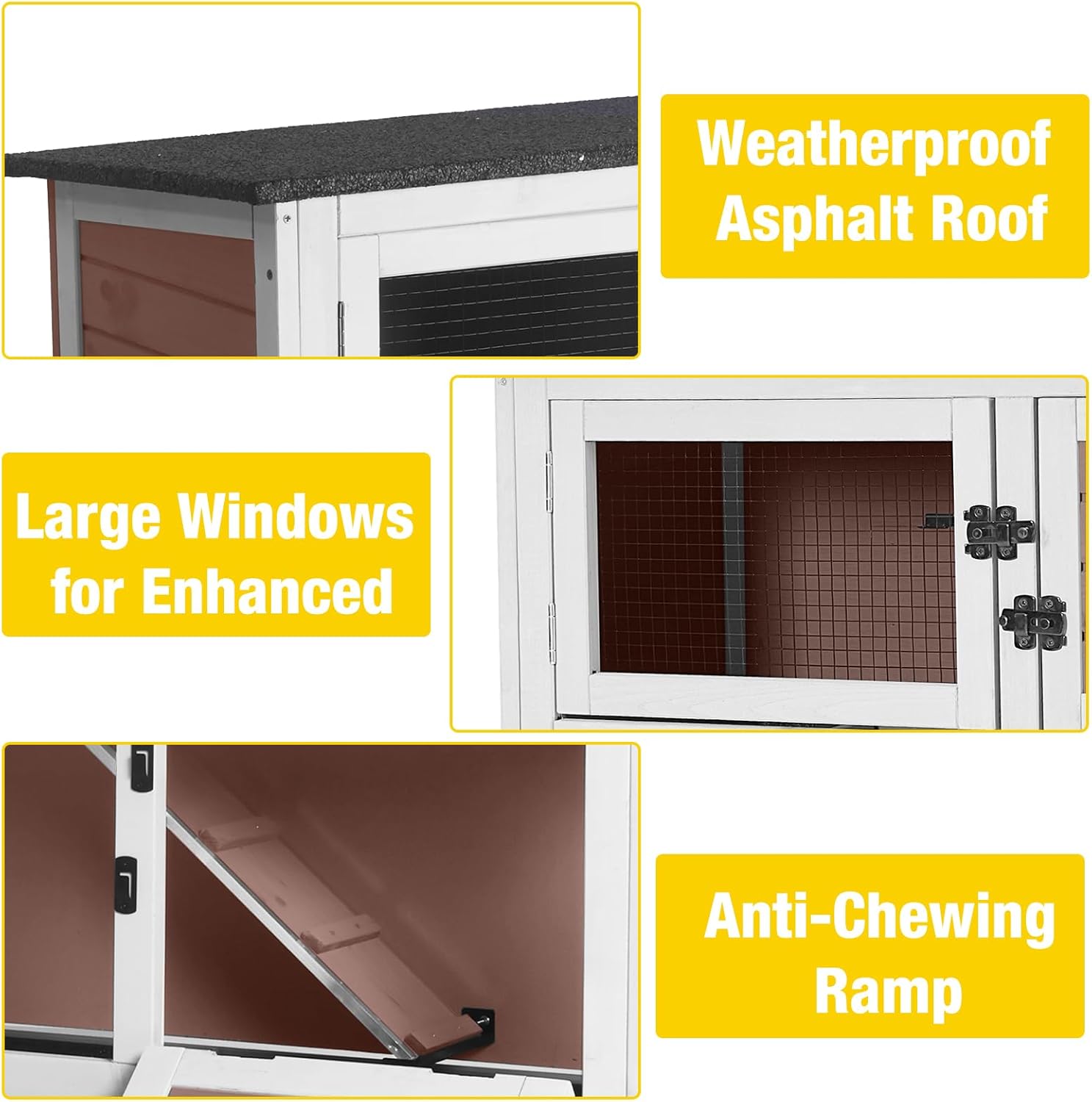 - All-Weather Protection: Weather-resistant asphalt roof and a cozy nesting box shield your pet from harsh conditions, ensuring year-round comfort and safety