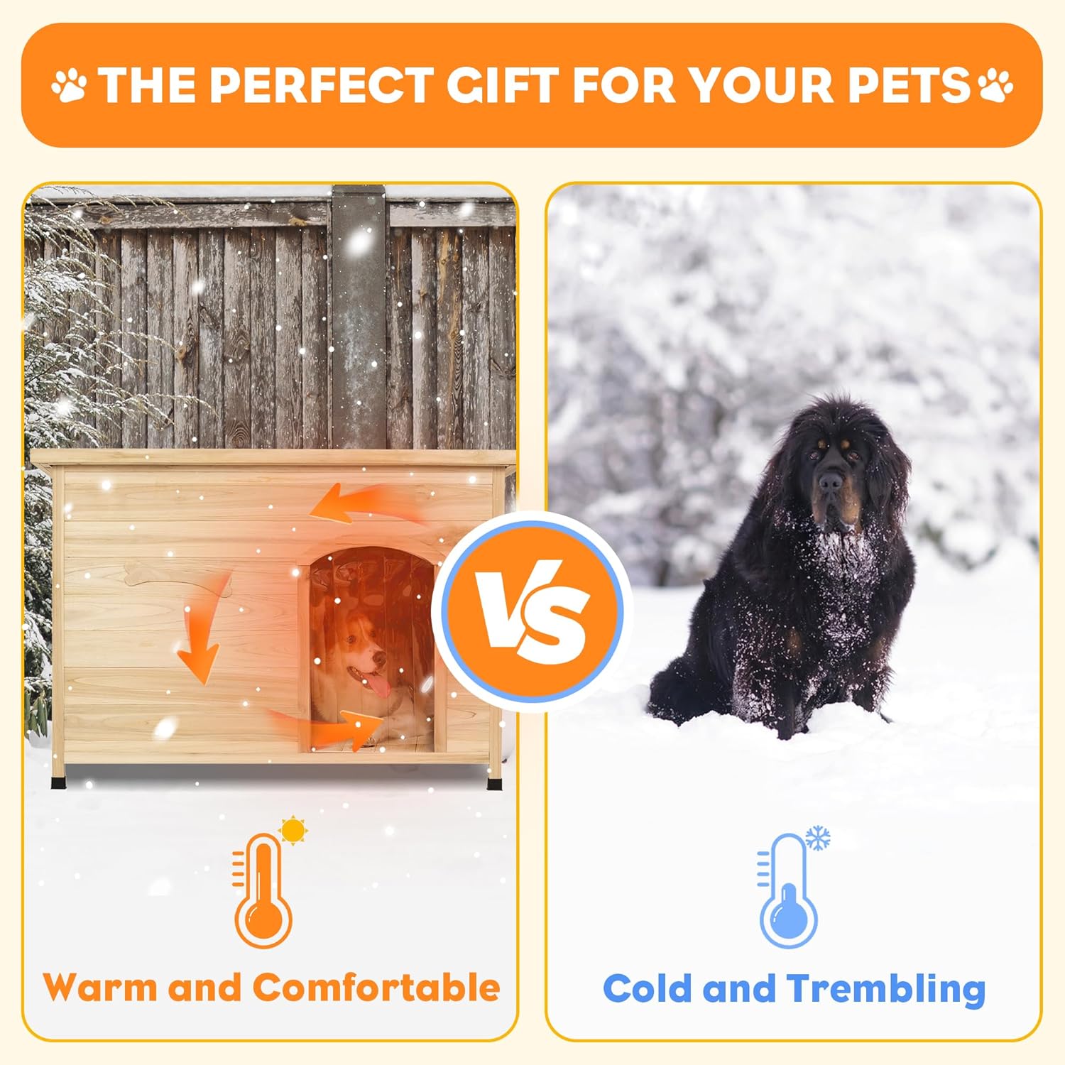- [Specially Designed for Outdoor Use] The sloping asphalt roof is expertly engineered to prevent rainwater from pooling, ensuring that your pet's living space remains dry and comfortable. The floor is 2.4โโ above the ground, and there is a removable PVC curtain and adaptable floor pads for uneven ground. This design enables the dog house to withstand harsh weather conditions, preventing water from seeping in and materials from getting damp